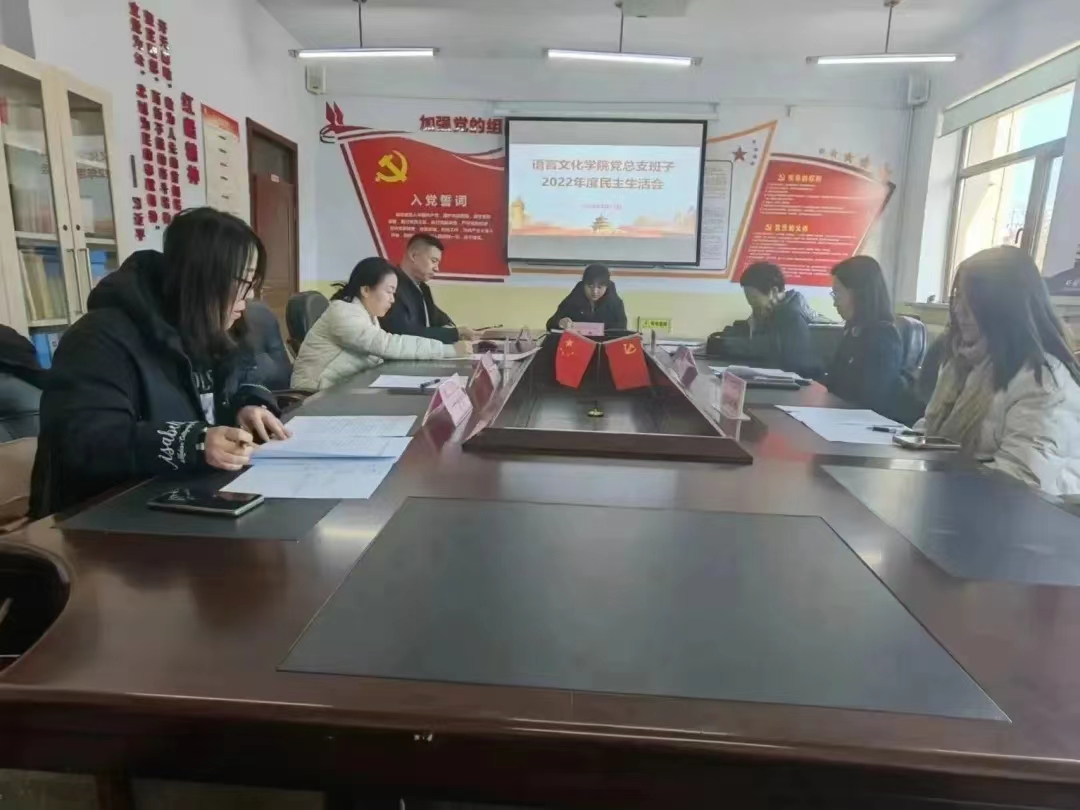 按照中央和省委、省委教育工委部署要求,根据中共吉林省纪委、中共吉林省委组织部《关于认真开好2020年度县以上党和国家机关党员领导干部民主生活会的通知》要求,语言文化学院党总支于2023年2月15日14:00在第一教学楼121会议室召开了2022年度民主生活会。此次会议由语言文化学院院长、党总支书记陈少志主持,长春科技学院副校长、组织部部长高杰莅临此次大会进行指导,党总支副书记陈恭鑫,组织委员张贺亮,宣传委员兼统战委员丁晓明,纪检委员付佳英,学生党支部书记曹莹,语言学工教师支部书记张晶,公共外语教师支部书记李炎芳出席了此次会议。