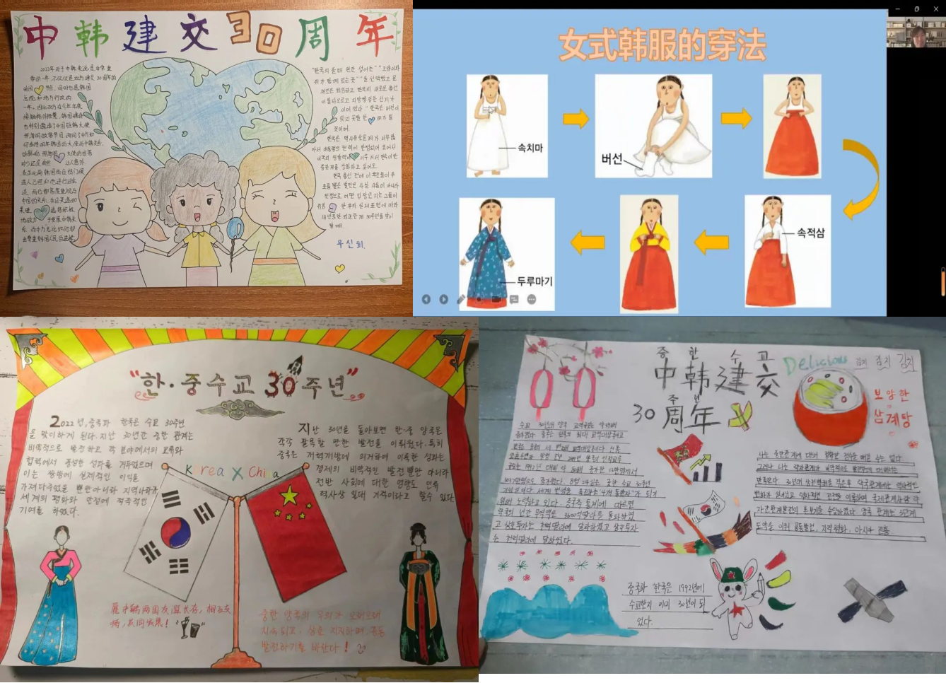 本次活动主要涵盖基础语言技能训练和韩国文化赏析两部分内容,考虑到特殊时期线上开展的情况,精心设计了充分利用软件和多种网络素材以达到教学活动目的的多种活动形式。例如,以谁是卧底的游戏形式开展的词汇大比拼、用韩国语讲好中国故事的成语典故翻译比赛、线上打字练习、影视剧配音、韩国经典影视作品赏析、以中韩建交30周年为主题的韩文手抄报设计等实践活动。整个活动过程注重理论与实践的结合,为帮助同学们巩固已学知识,增加词汇量,提高听说能力,拓展文化视野起到了十分重要的作用。