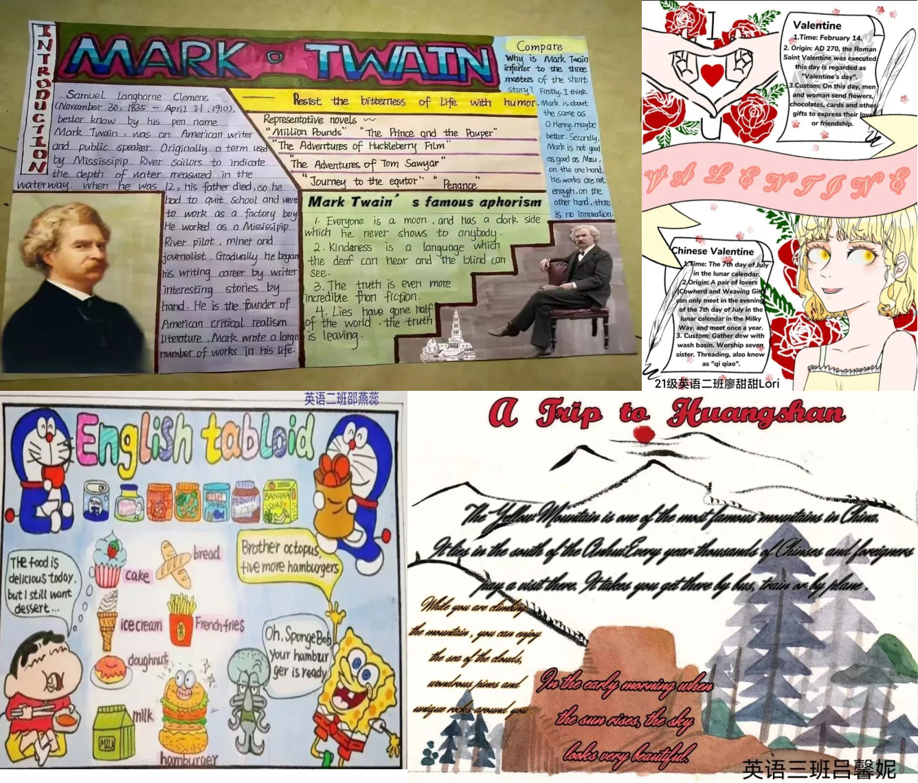 在英语海报比赛中,我院英语专业学生充分发挥主观能动性,尽情挥洒自己的才华。海报形式各异,或平面,或立体,或制作成册。这些精心制成的海报不仅反映出我院英语专业学生对课本知识的深度学习,更体现出了他们对于英语学习的浓厚兴趣和喜爱。无论是字体书写的精美程度还是插图颜色的绝妙搭配均是对一句古训的完美诠释:用 心做事,则无事不成。