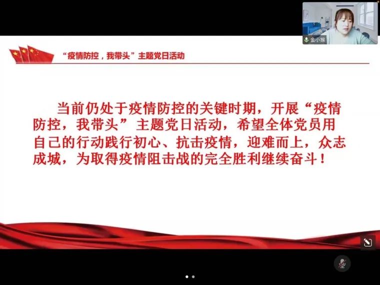 紧接着,公共外语教师党支部全体党员充分进行了防疫经验交流活动。李炎芳老师积极参与到自己居住的净月开发区中信城枫丹白露小区中,协助社区工作人员进行信息统计、人员排查、维持秩序,帮助年迈老人和孩子订购和运送防疫物资、线上为社区孩子进行作业辅导、主动为社区捐赠物资。李炎芳老师表示:“这些都是生活琐事,作为共产党员,我们要起到先锋模范用,从身边小事做起,充分发挥党员的积极带头作用,攻克难关。”