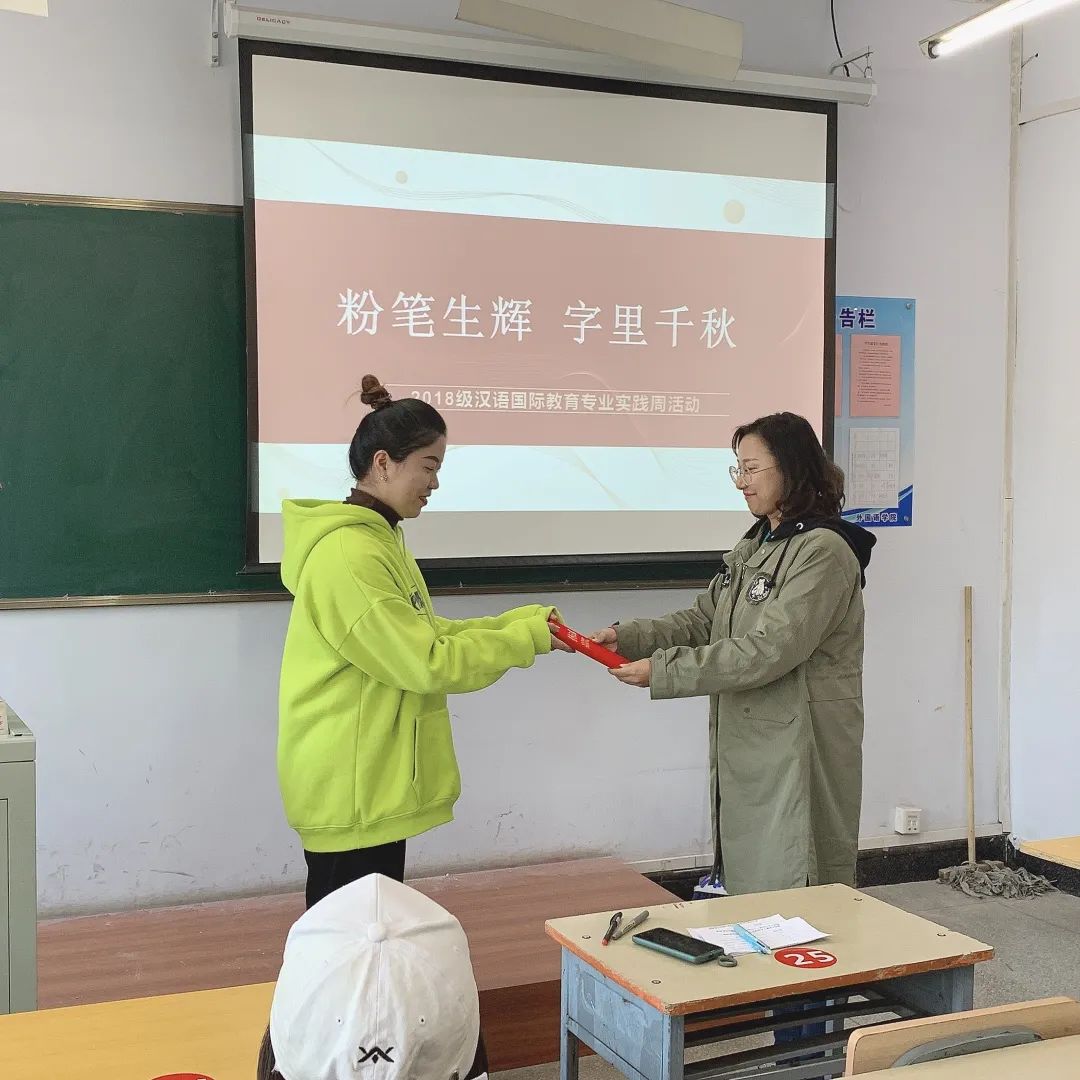 中国书法是一门古老的汉字书写艺术,从甲骨文、石鼓文、金文演变为大篆、小篆、隶书,定型于东汉、魏、晋的草书、楷书、行书等,书法一直散发着独特的艺术魅力。为了继承和发展中华书法艺术,弘扬民族文化,强化汉语国际教育专业学生写好粉笔字的意识,切实提高学生的板书书写技能,语言文化学院2018级汉语国际教育专业于2020年10月14日下午一点半,在一教214教室举行了以“粉笔生辉,字里千秋”为主题的粉笔字大赛。