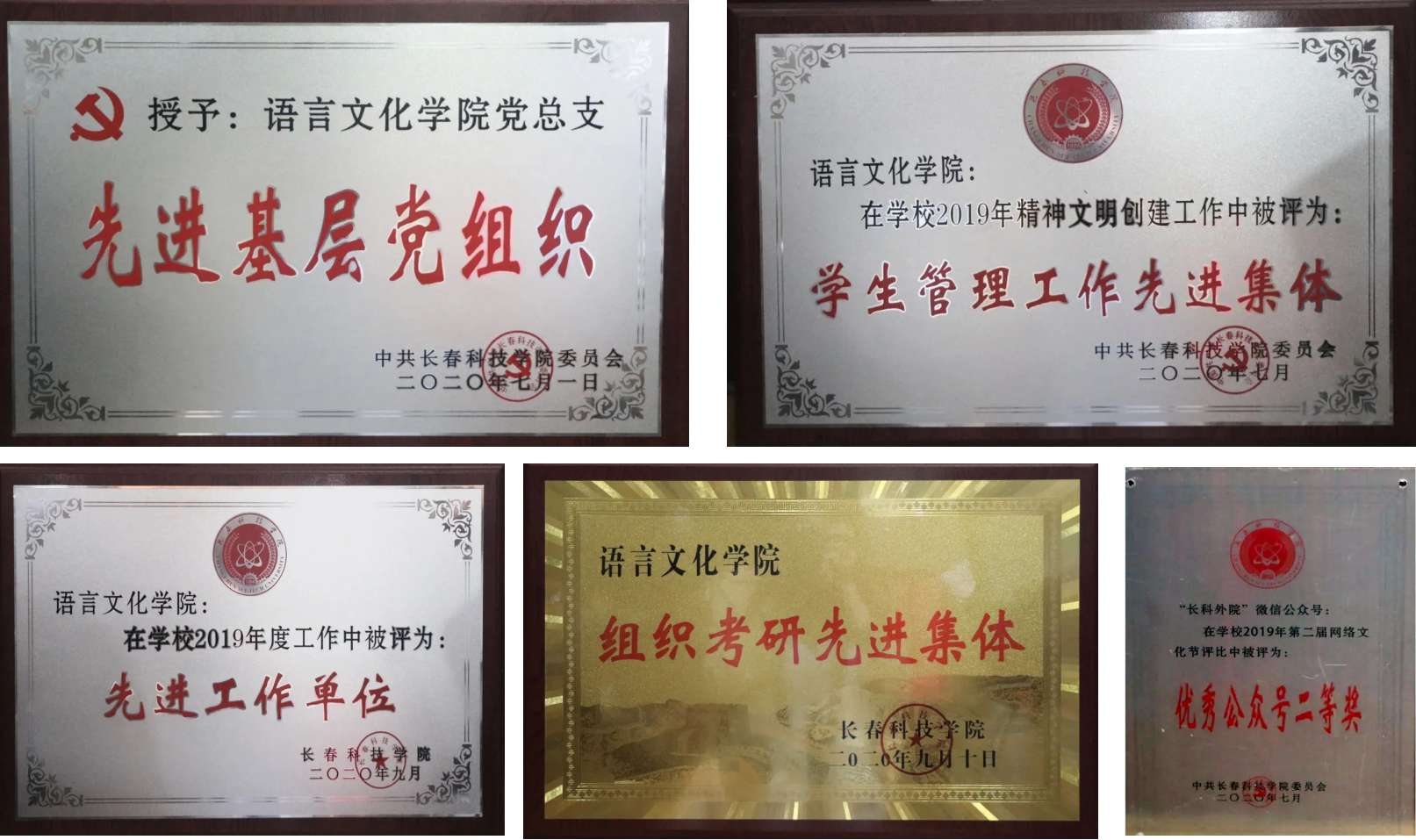 长科外院公众号荣获第二届网络文化节大赛“优秀公众号”二等奖奖项,视频类《五四——以青春的名义》荣获二等奖,视频类《追梦人不负韶华》荣获三等奖,网文类第二课堂之“饭局也疯狂”荣获三等奖;19级辅导员谷振宇荣获“优秀通讯员”的称号……这些奖项是对我院教师和学生辛勤劳动与付出的表彰,展现了我院教师坚守岗位、独占鳌头的东华精神和激情四射的工作热情,也是对我院2019年度工作的肯定。