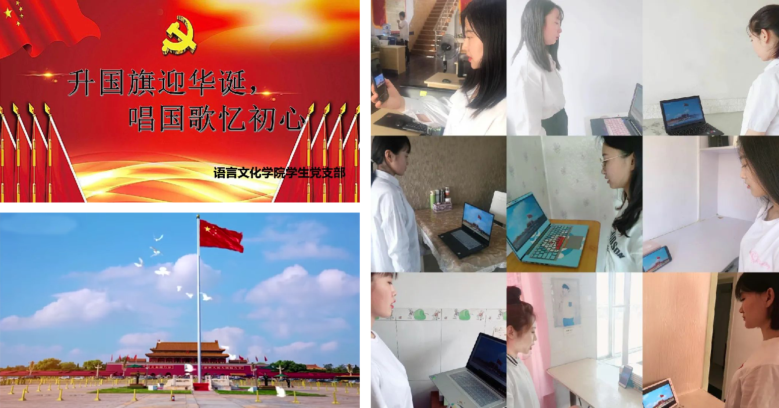 升国旗迎华诞,唱国歌忆初心。全体学生党员面对屏幕中慢慢升起的国旗肃立,伴着雄壮的音乐齐声高唱中华人民共和国国歌,庄严的国歌声,点燃了党员心中激情,让每一位在场的党员心潮澎湃,大家用歌声感受和表达对祖国的热爱。