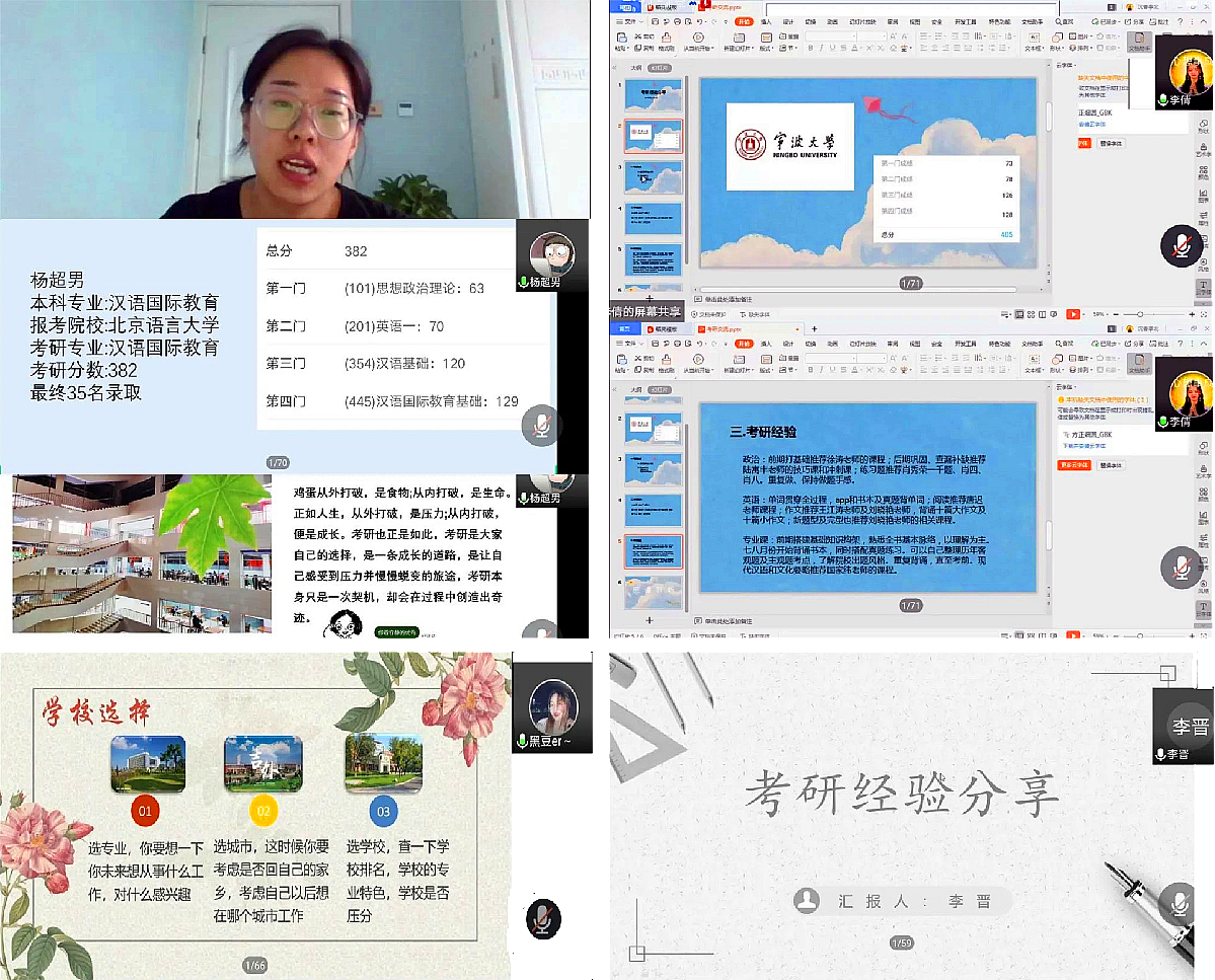 目前,即将考研的学生大部分正处在迷茫时期,在这个关键的时期,学院通过本次经验交流会帮助在校生拨开了眼前迷雾,不仅为即将考研的学生留下了宝贵经验,还为立志考研的学生指引了方向,坚定了他们考研的信念,使他们可以凭借积极的心态面对这巨大的挑战,相信同学们通过参加本次交流会,一定更有拼搏的信心与力量。感谢学姐们带着满满的经验和忠告与我们在“云”端一聚,祝愿所有毕业的学姐学长们前途灿烂光明,也预祝准备考研的同学们,研途通畅、金榜题名!