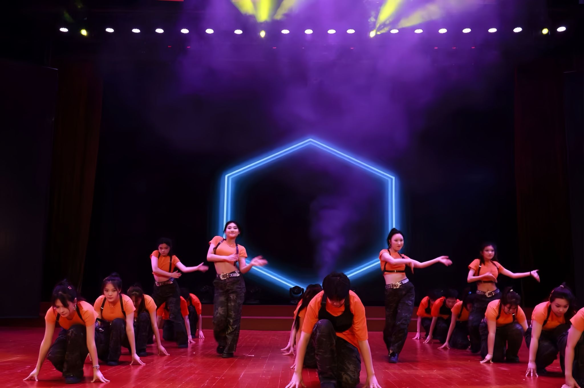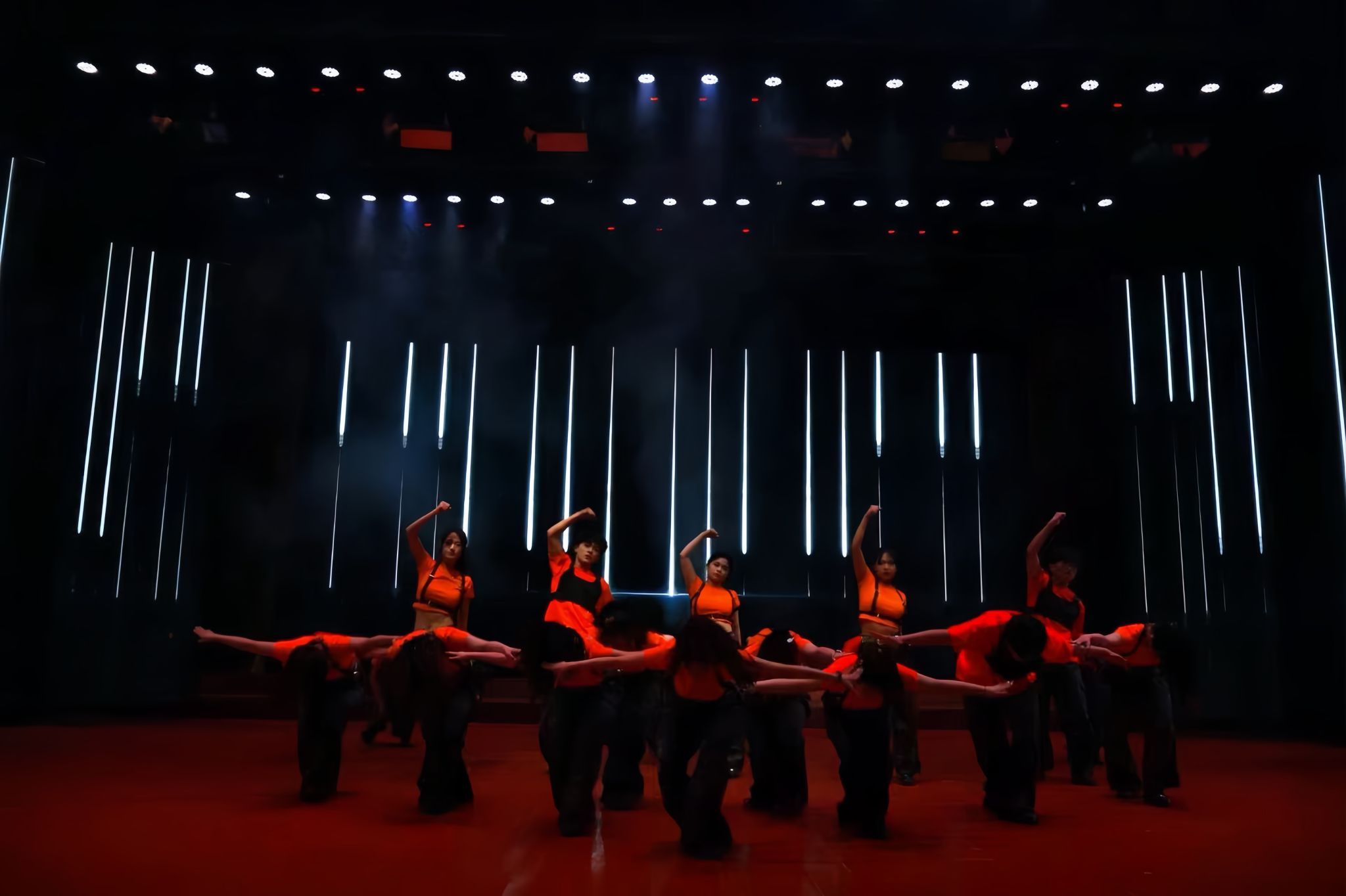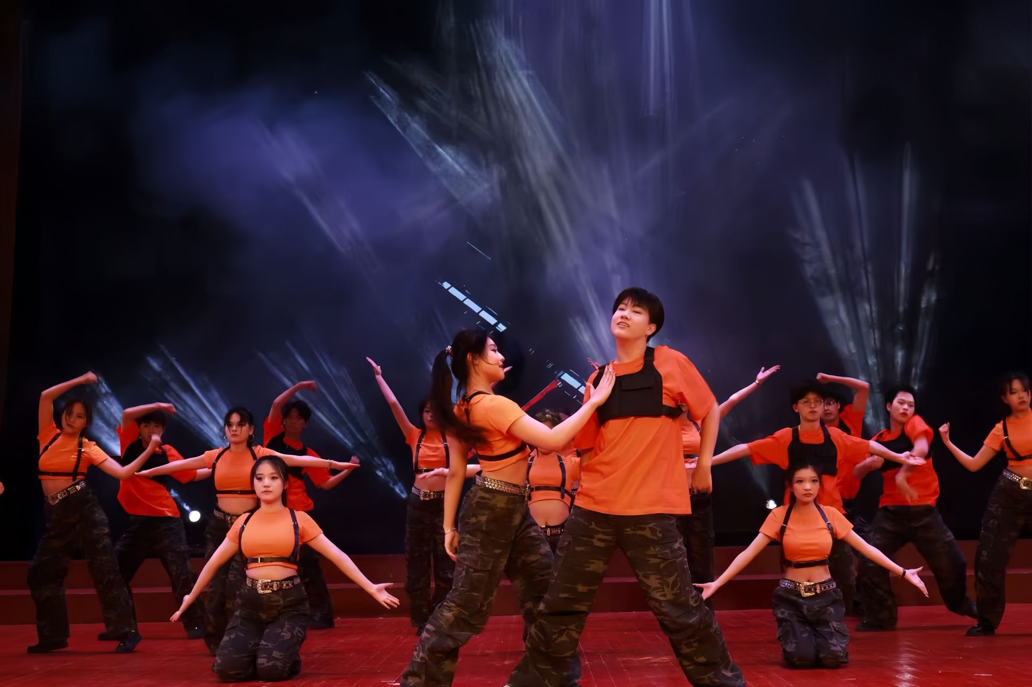 “青春跃动,舞力全开!”舞台上,我院舞者以整齐划一的队形点燃全场,带来充满张力的现代舞《OK family》。他们将爆发式的跳跃与利落的现代舞线条完美融合。旋转时衣摆飞扬如绽放的花火,定格时肌肉控制展现极致酷飒。演员们身着赤橙色服装,用充满生命力的肢体语言诠释着青少年特有的自信与不羁。