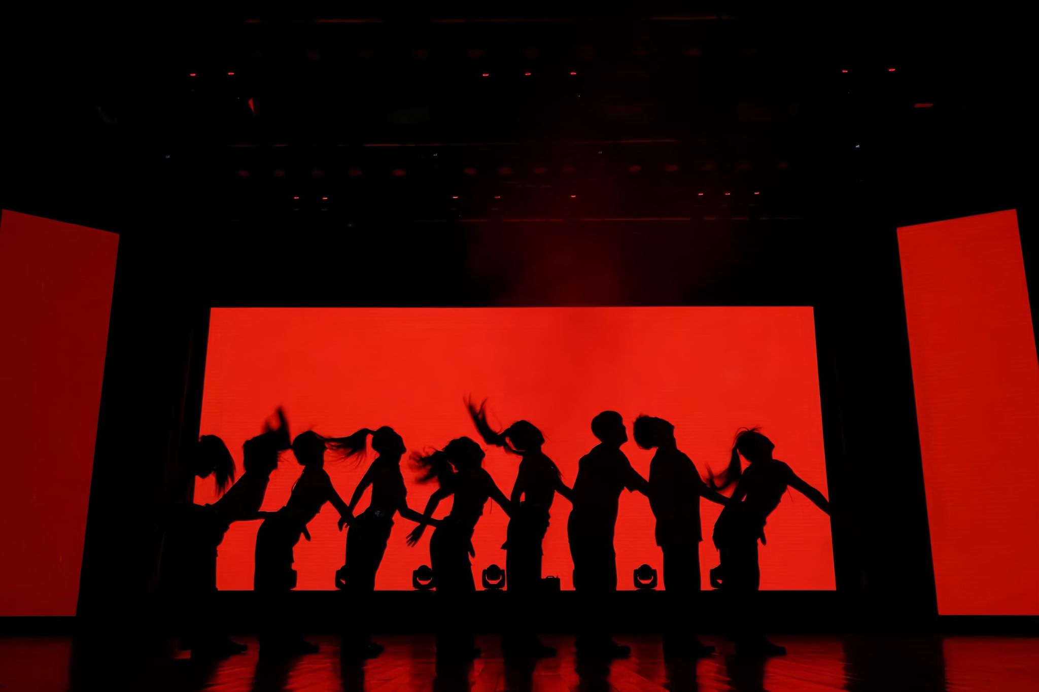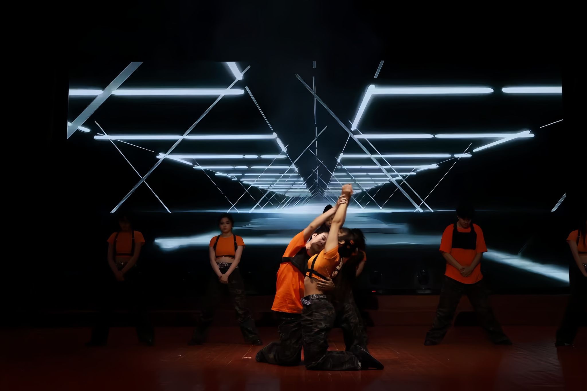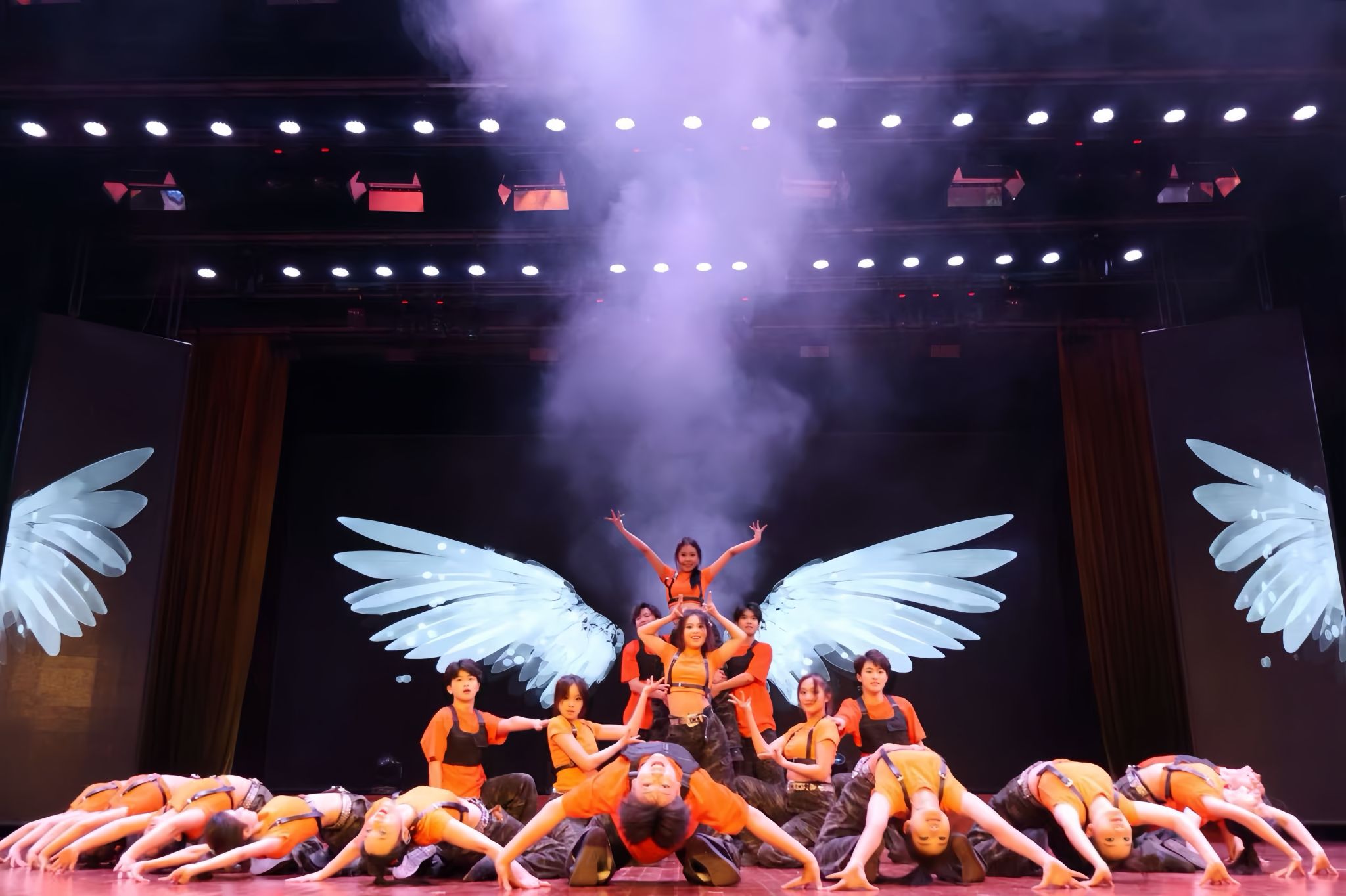 “青春跃动,舞力全开!”舞台上,我院舞者以整齐划一的队形点燃全场,带来充满张力的现代舞《OK family》。他们将爆发式的跳跃与利落的现代舞线条完美融合。旋转时衣摆飞扬如绽放的花火,定格时肌肉控制展现极致酷飒。演员们身着赤橙色服装,用充满生命力的肢体语言诠释着青少年特有的自信与不羁。