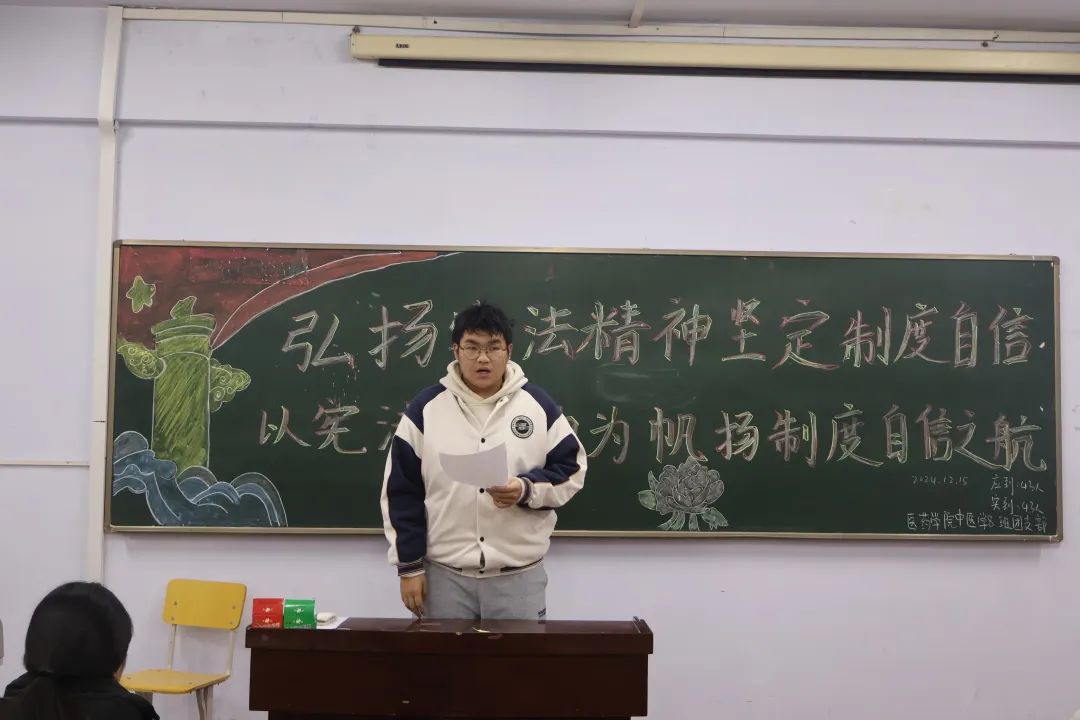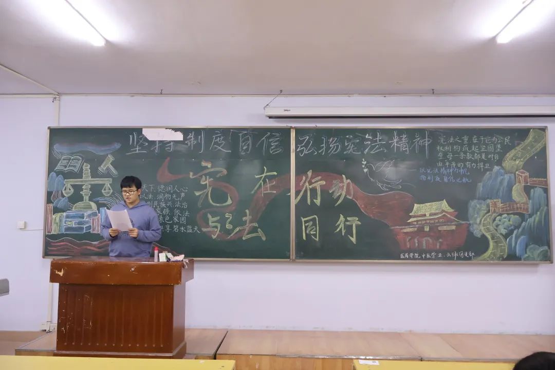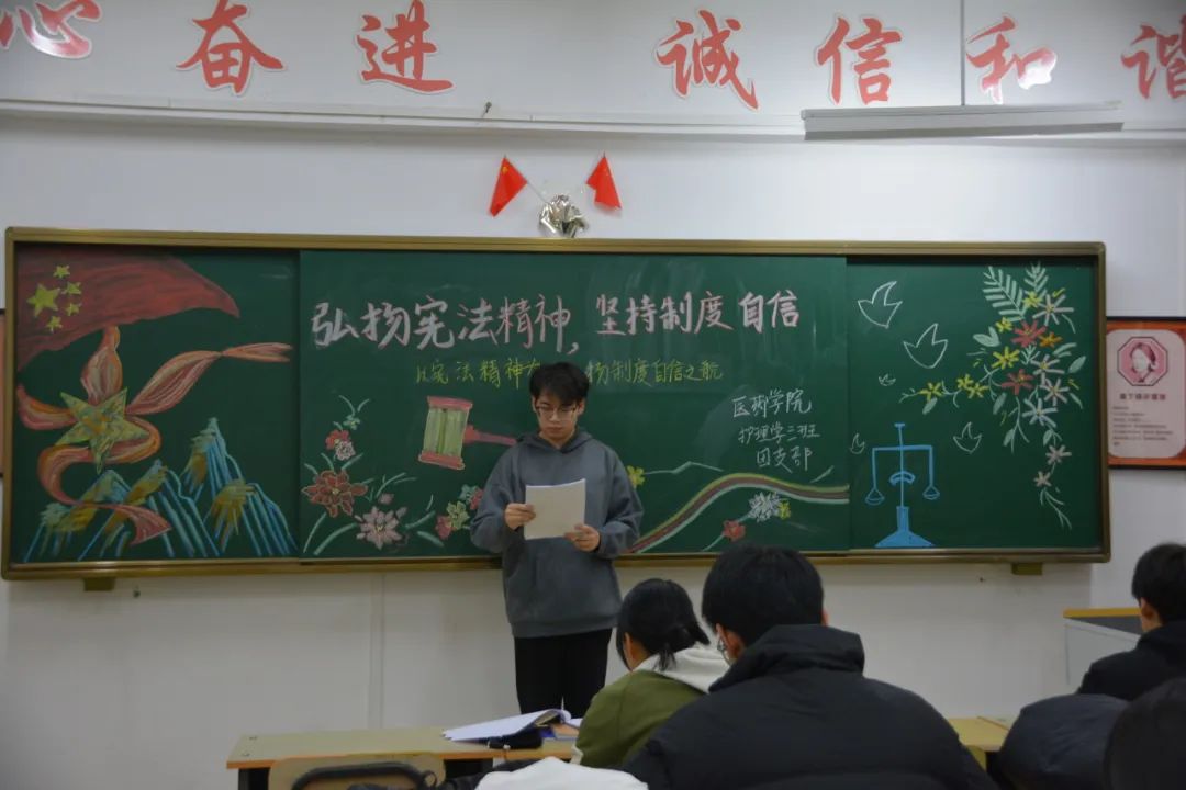 为进一步增强广大师生的法律意识和法治观念,积极营造和谐校园氛围,医药学院于12月15日18:00在各班级开展以“弘扬宪法精神,坚定制度自信”为主题的团会,大力宣传以宪法为核心的社会主义法治体系,弘扬法治精神。