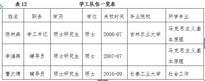 学院设置了学生工作管理机构。制定了辅导员管理办法、加强学生管理等相关文件。按照职业化目标积极开展辅导员队伍建设。我院有党委书记1人,专职辅导员2人。师生比1:266。学校实行导师制,每100名学生配备一名导师,对学生的学习和生活进行多方面的帮助和指导,形成了知己、朋友的师生关系。