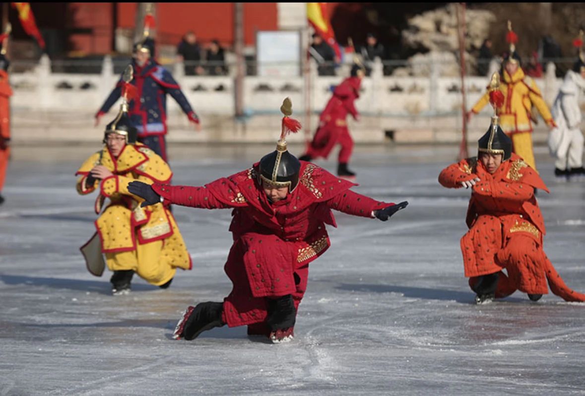 中国北方各省,入冬之后天寒地冻,冰期十分长久,人们在冰面特厚的地方,设有冰床,供行人玩耍,也有穿冰鞋在冰面竞走的,古代称为冰戏。