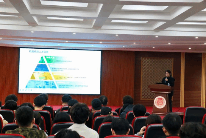 企业代表张雁老师向同学们展示了公司的企业文化、发展历程及取得的显著成就。对同学们普遍关心的实习与就业问题进行了深入讲解。实习方面,介绍了公司为实习生提供的全面培训计划,包括专业技能培训和实践项目指导,帮助同学们快速融入工作环境,提升实际操作能力;就业方面,分析了行业人才需求特点,列举了公司针对电子信息类专业设置的多个岗位,明确了各岗位的职责、任职要求、薪资待遇以及完善的职业晋升通道,鼓励同学们积极投递简历,为未来就业早做准备。