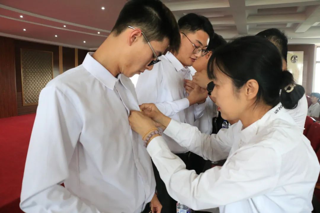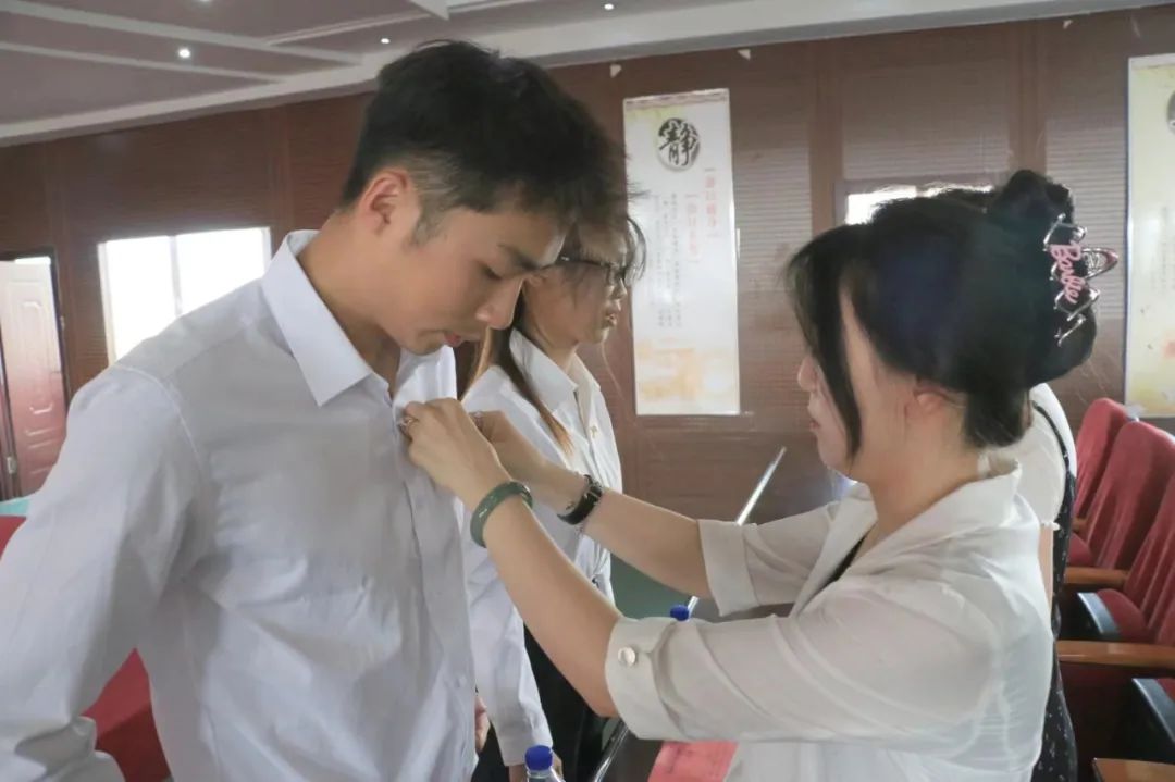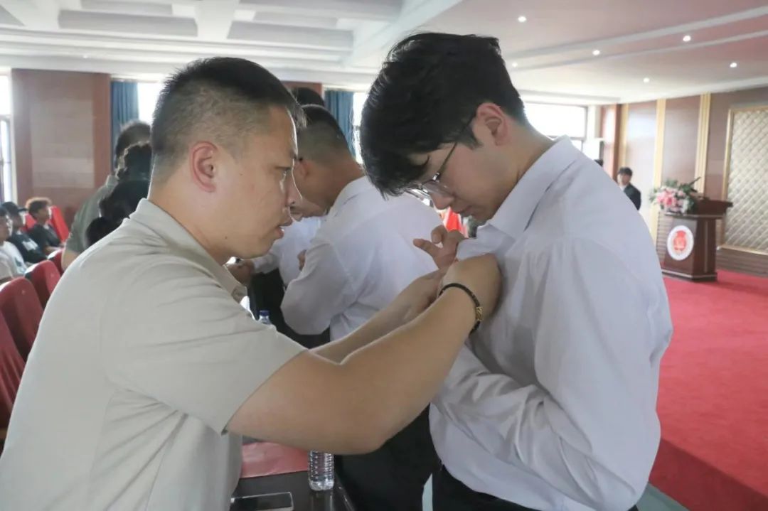 参会领导为新党员佩戴党徽,在领誓人徐锐、高媛的带领下,新党员们整齐列队,面向党旗,举起右拳,庄严宣誓,铮铮誓言,响彻会场,表达了新党员们对党的忠诚和为共产主义事业奋斗终身的坚定决心。