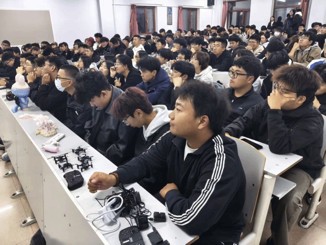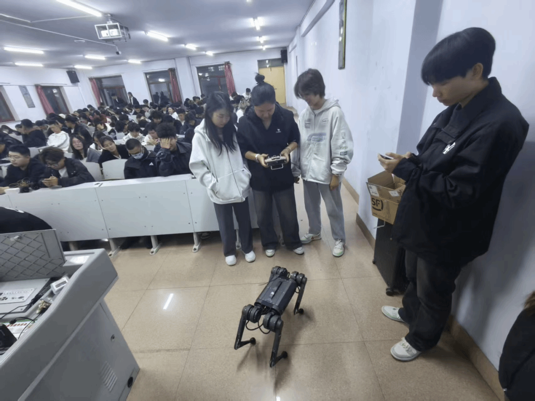 此外,协会还特别安排了智能装备实操演示环节。经验丰富的学长现场操控机械狗与无人机,展现智能装备的灵活性能—— 机械狗在指定区域内完成行走、转弯、避障等一系列动作,精准响应指令;无人机则进行低空悬停、航线规划飞行,并实时传输空中视角画面。演示过程中,学长详细介绍了机械狗的关节电机、传感器等硬件构造,以及无人机的飞行控制系统、定位技术与安全操作规范,同时分享了这些智能装备在工业巡检、科研实验等领域的应用案例,让新生对智能制造的实际应用场景有了更深入的了解。