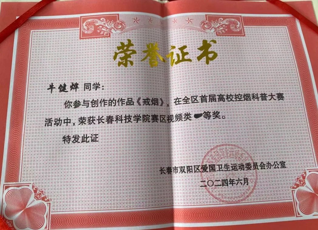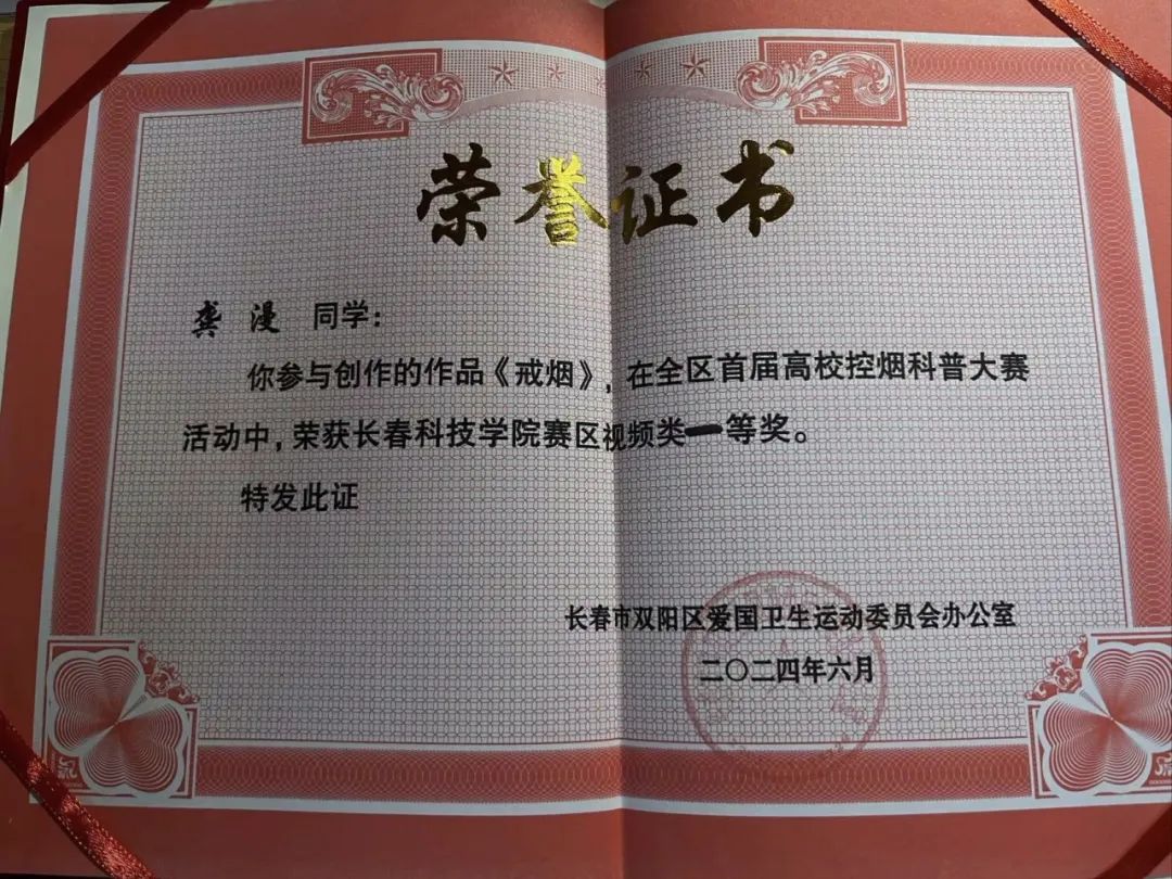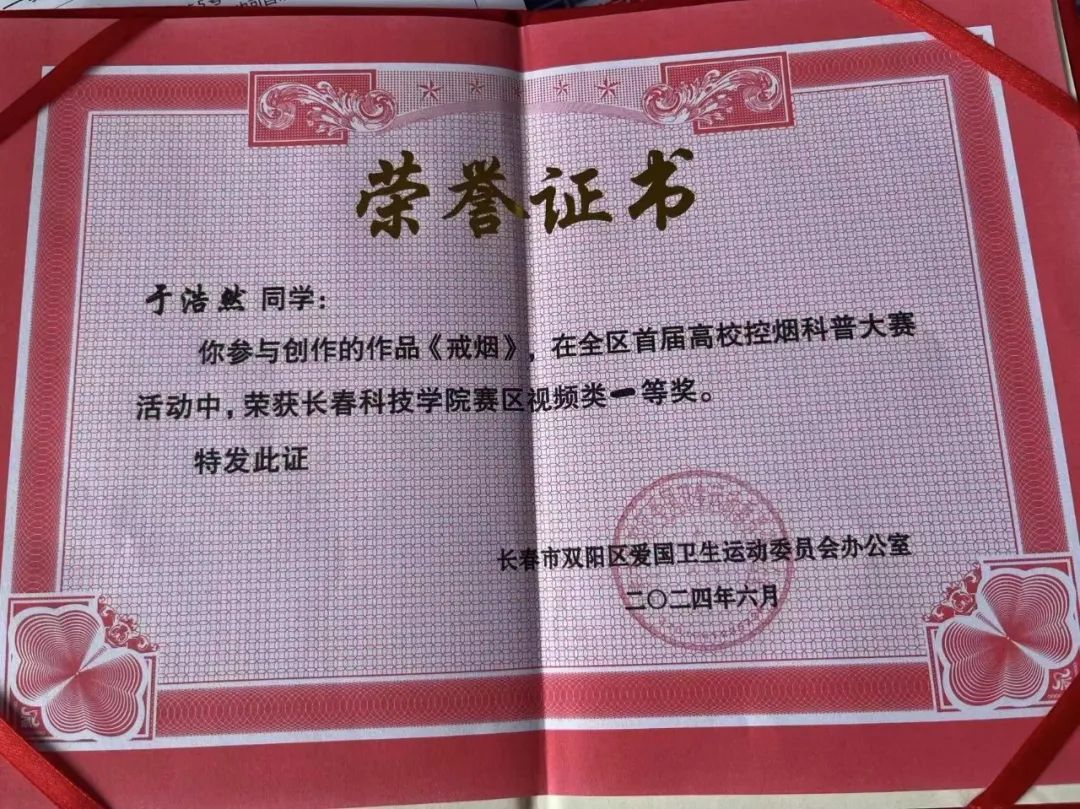 为推动实现健康中国建设战略目标,巩固无烟学校建设成果,有效降低大学生的吸烟率。在双阳区首届高校“创建无烟校园,拥抱健康生活——控烟科普大赛中,我院学生创作的作品《戒烟》,荣获长春科技学院赛区视频类一等奖。