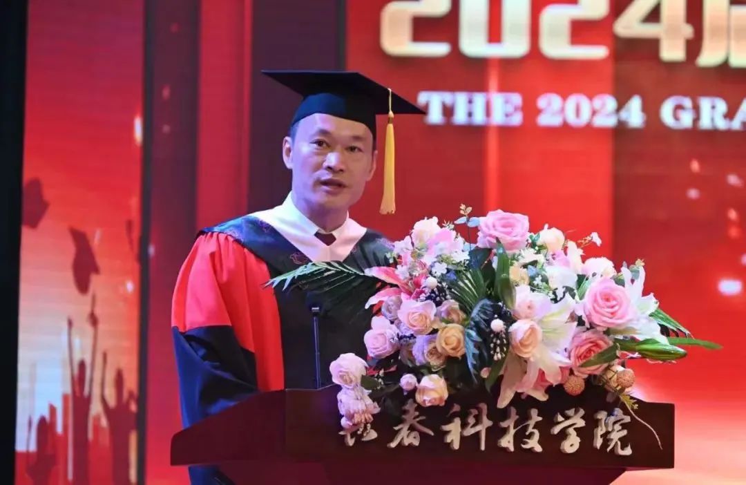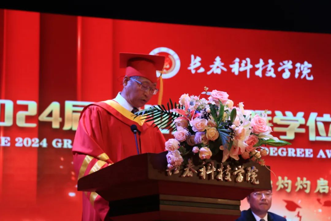最后由长春科技学院校长栾立明致辞。他代表董事长张电达、学校党政领导班子成员对2024届全体毕业生送上了最诚挚的祝福与殷切的期望。