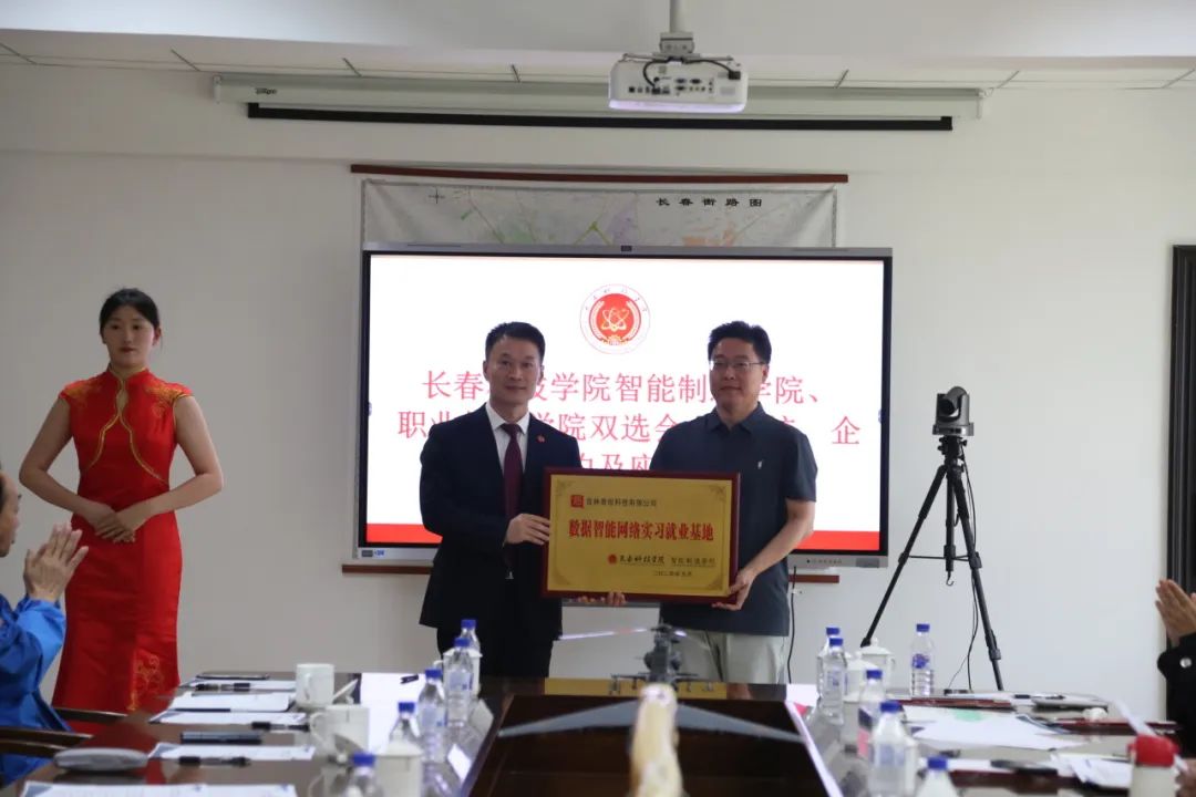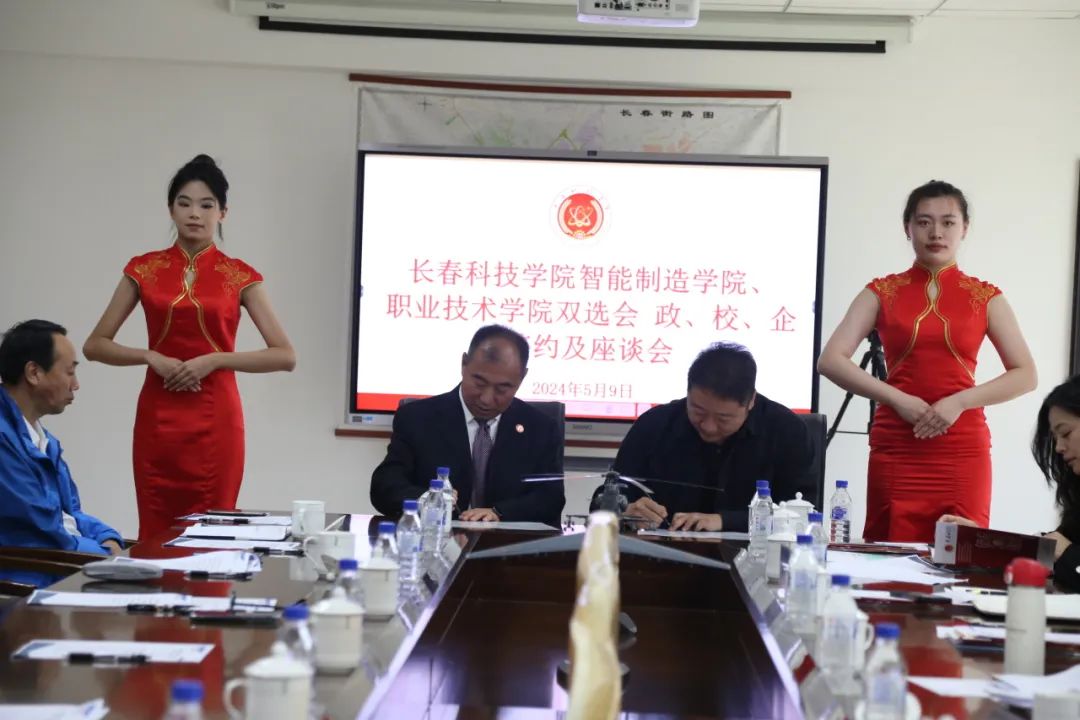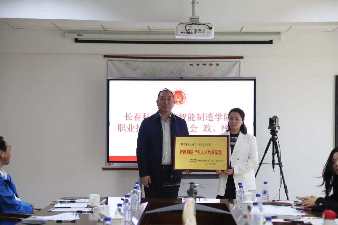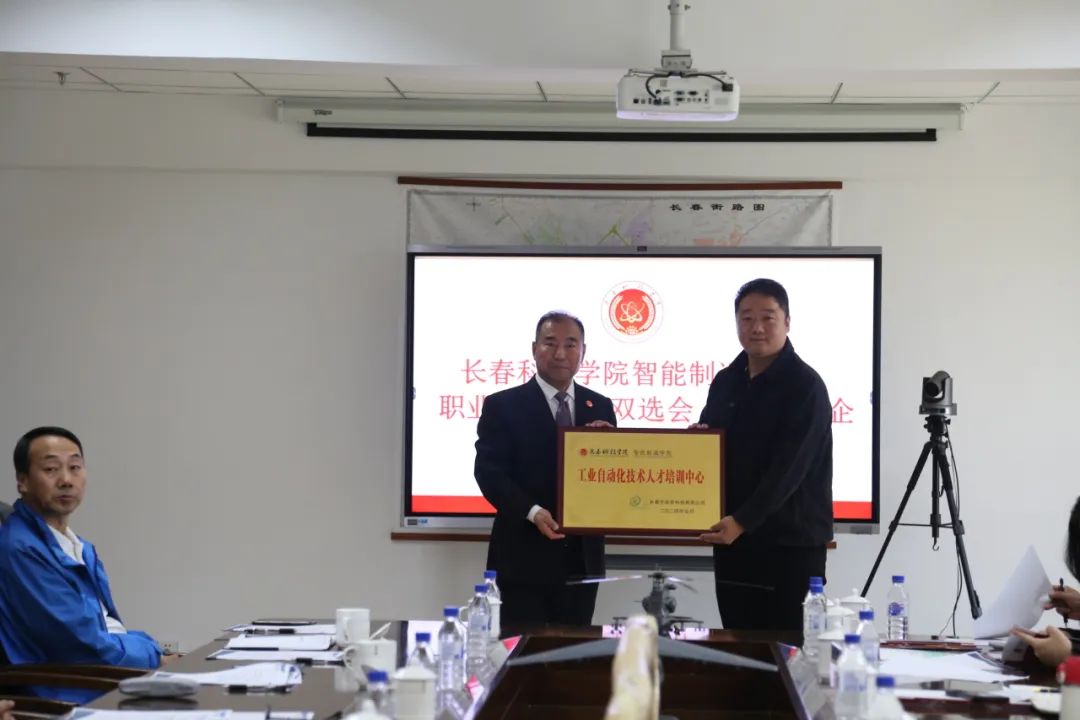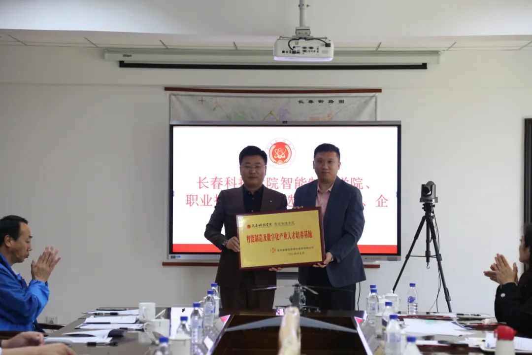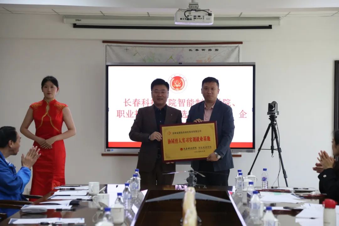 智能制造学院分别与菁华科技有限公司、育信科技有限公司、酷铂自动化技术有限公司、欧博森智能传动有限公司和长春市启荣科技有限公司签署了校企合作协议并互授牌匾。