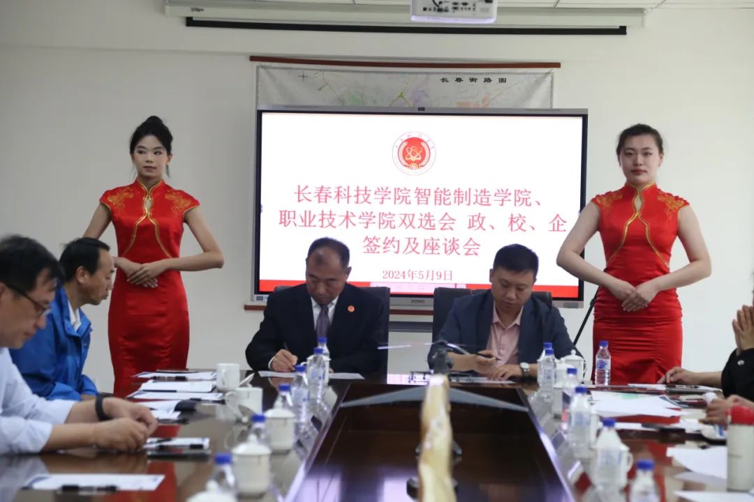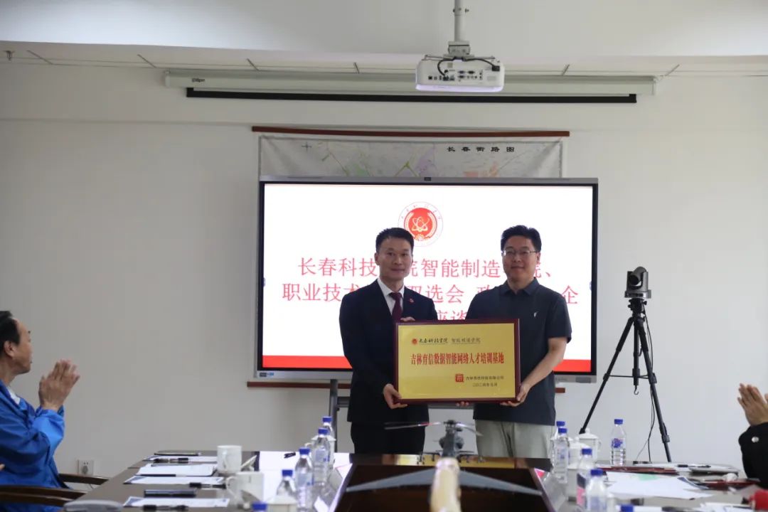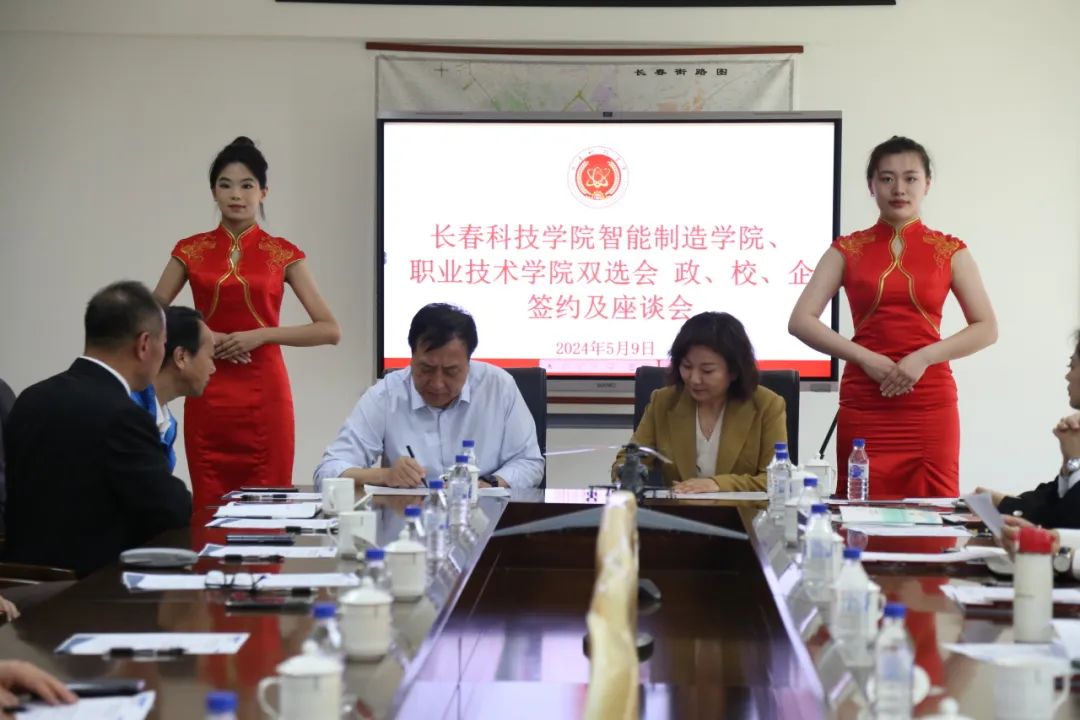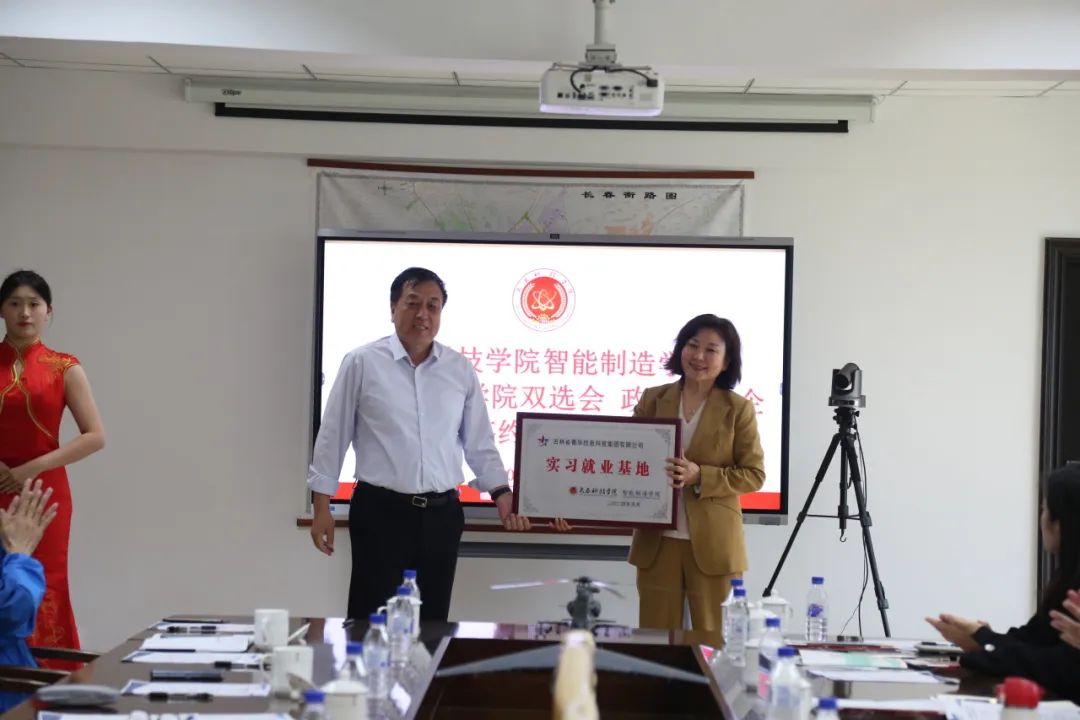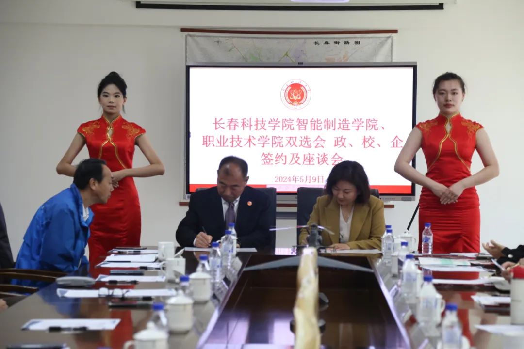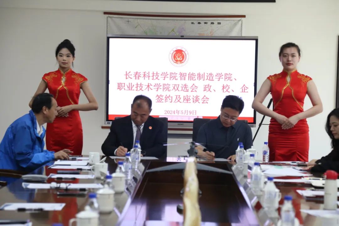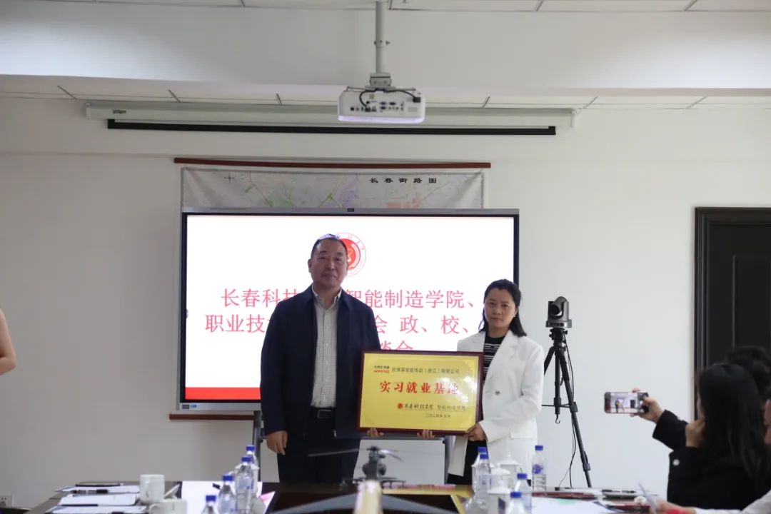 智能制造学院分别与菁华科技有限公司、育信科技有限公司、酷铂自动化技术有限公司、欧博森智能传动有限公司和长春市启荣科技有限公司签署了校企合作协议并互授牌匾。