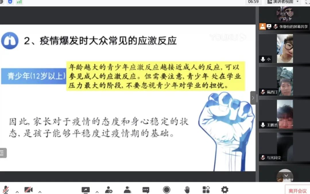 活动期间,各班主持人利用丰富精彩的PPT、视频介绍等方式引导同学们浏览疫情相关信息,正视疫情;引导大家如何接纳自身情绪,管理自身情绪和压力。