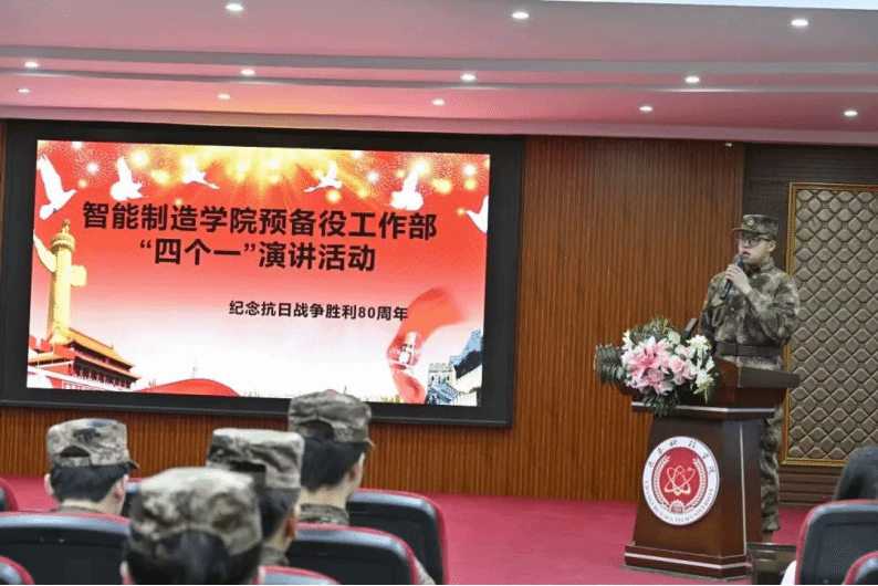 为了进一步激发同学们对历史的敬畏与思考,深入了解中国人民抗日战争的伟大历程和深远意义,传承红色基因,弘扬伟大抗战精神。智能制造学院预备役工作部于4月13日开展“四个一”演讲活动。