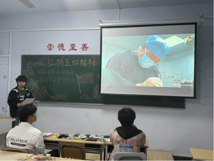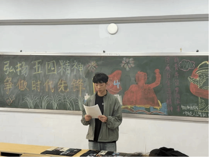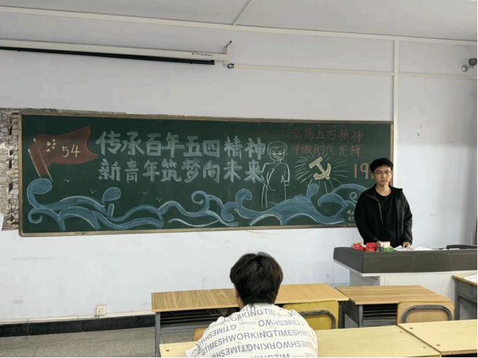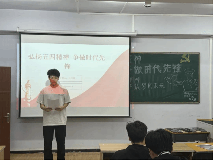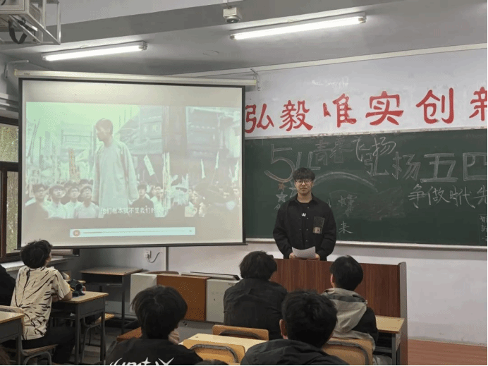 随后,各班主持人详细介绍五四精神“爱国、进步、民主、科学”的核心内涵,通过讲述一个个生动的历史故事,将同学们带回到那个激情燃烧的岁月。从学生们高呼口号游行抗议,到先进知识分子传播新思想新文化,展现出五四青年为追求国家富强、民族振兴所付出的努力与牺牲,让同学们深刻理解五四精神的丰富内涵和时代价值。