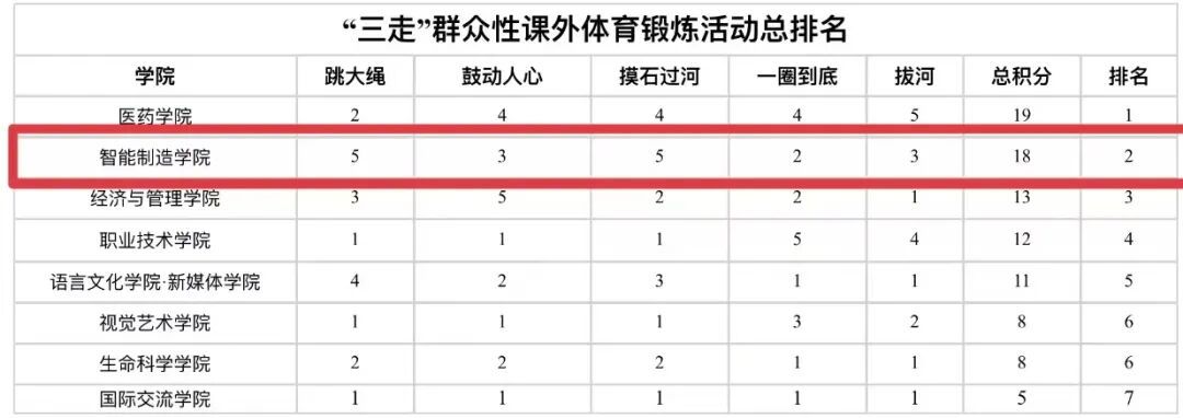 为了响应“走下网络、走出宿舍、走向操场”的校园号召,智能制造学院学子全力奔赴校“三走”系列活动赛场!从跳大绳的默契配合到拔河赛场的众志成城,他们用每一次冲刺、每一份坚持突破自我,最终斩获总排名第二名,让青春在运动中绽放光芒。