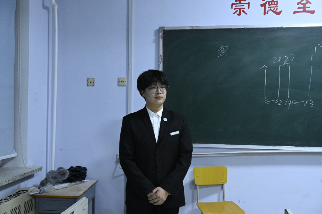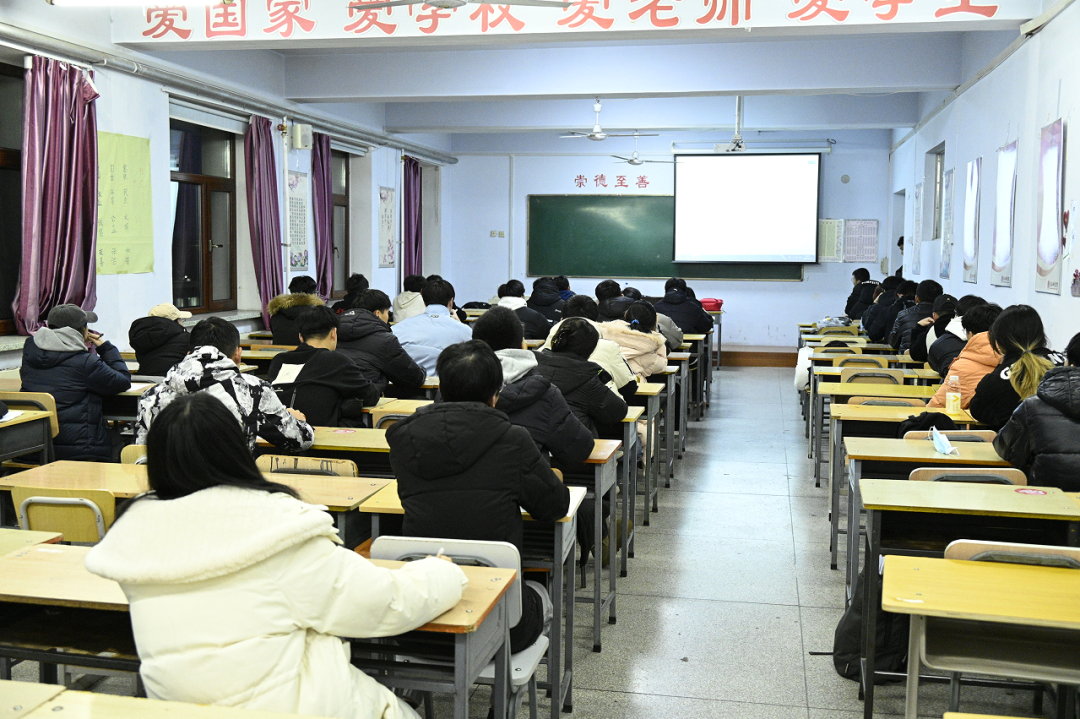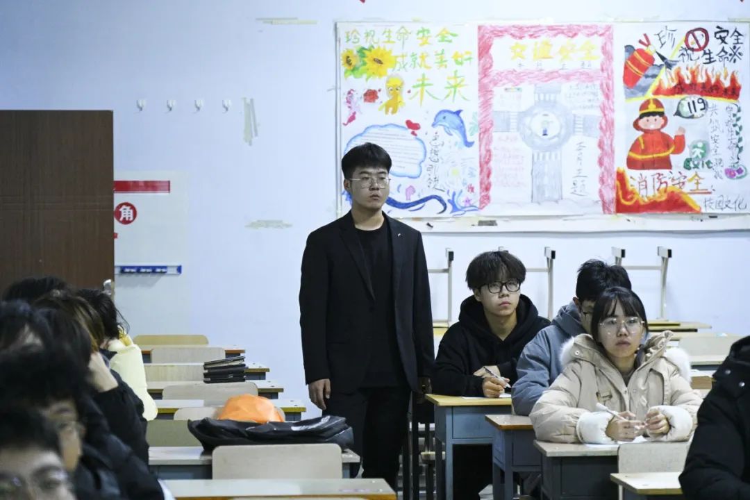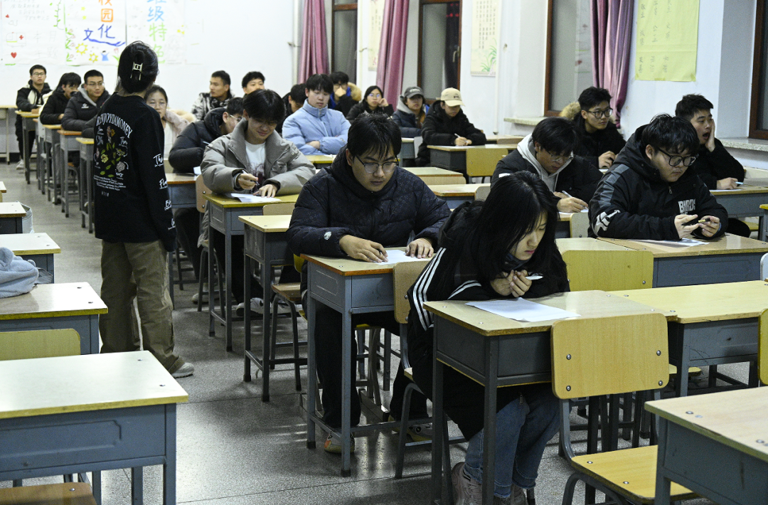 考场内只听见笔尖在答题卡上忙碌划过的声音,伴随着偶尔翻动试卷的轻响。同学们低头沉思的身影显得十分专注。监考人员在场内巡视,以确保考试的公平公正。