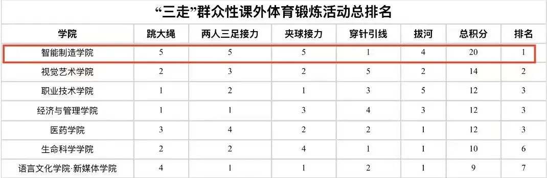 青春正当时,运动展风采。为鼓励同学们“走下网络、走出宿舍、走向操场”,养成良好的体育锻炼习惯,提高身体素质,我校举办了“三走”系列活动。在这场充满激情与活力的竞技中,我院荣获总排名第一名的好成绩。