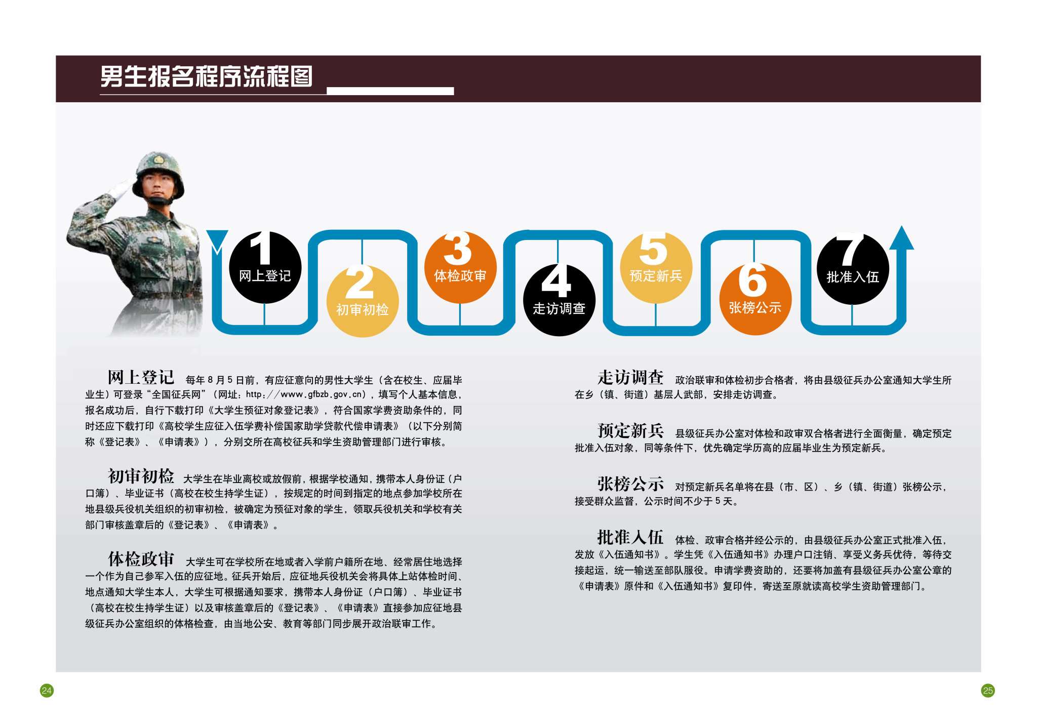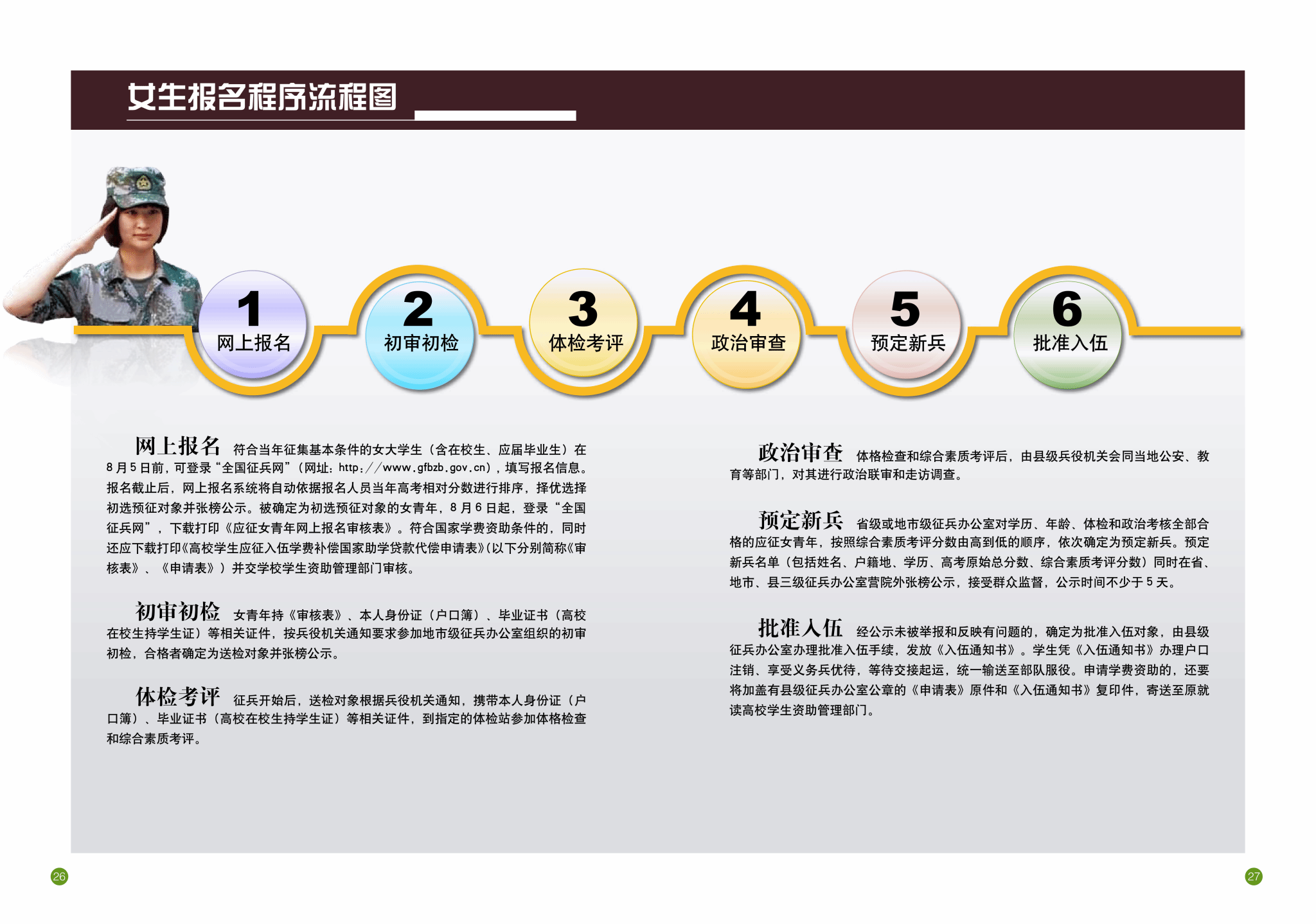 (1)义务兵征集。适龄青年可登录“全国征兵网”自行报名应征,报名通过后根据应征地兵役机关通知参加后续征集工作,通常包括初检初考、体格检查、政治考核(女兵含综合素质考评)、役前教育、审批定兵、交接起运等。