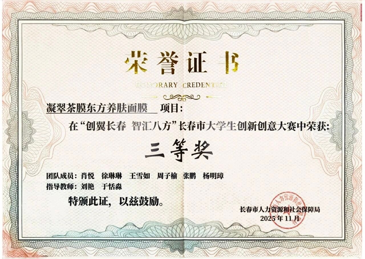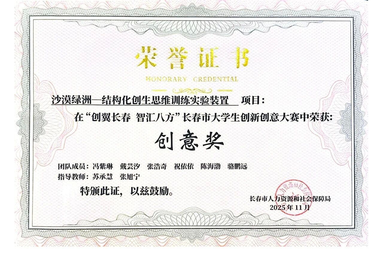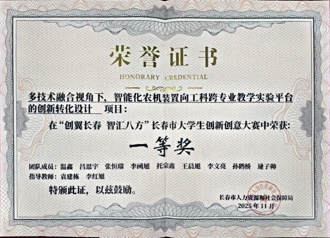 在本届大赛中,长春科技学院学子展现出卓越的创新实力与竞技水平,共五个项目荣获奖项,覆盖智能制造、生态农业、教育技术等多个前沿领域。其中,温鑫、吕思宇,张恒瑞等同学负责的《多技术融合视角下,智能化农机装置向工科跨专业教学实验平台的创新转化设计》项目,以其突出的技术集成性与应用价值,获得大赛一等奖。此外,苗维伦项目团队的《NT新型生态液体地膜》获二等奖,肖悦项目团队的《凝翠茶膜东方养肤面膜》获三等奖,陈晗硕项目团队的《参能方舟——吉林九制黑参功能性产品创制者》与冯紫琳项目团队的《沙漠绿洲——结构化创生思维训练实验装置》获创意奖。