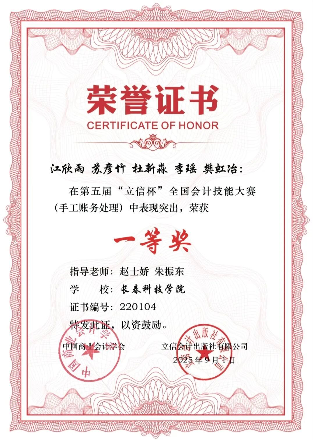 本次大赛聚焦手工账务处理全流程实操能力,以制造业仿真经济业务为背景,考核选手建账、原始单据处理、账簿登记、报表编制与分析等核心技能。赛事吸引全国众多院校参与,长春科技学院组建多支队伍参赛,在赵士娇、朱振东、袁佳月等指导老师的带领下,最终收获累累硕果: