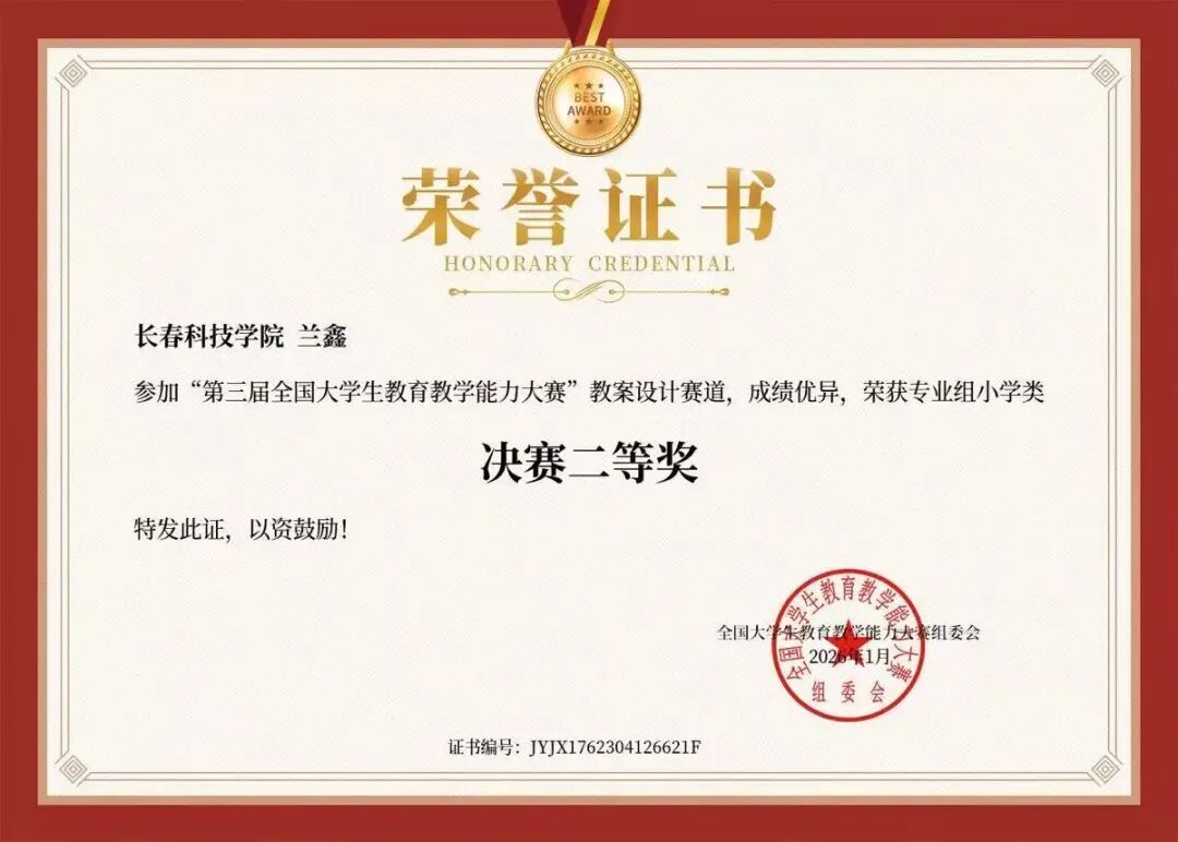 本届大赛聚焦大学生教育教学核心能力的考察,覆盖教学设计、课堂授课、教学反思等多个核心环节,全面检验参赛选手的师范专业素养与实践应用能力。教育与文化传播学院高度重视此次赛事,组织专业教师团队对参赛学子进行系统化指导,从教学设计打磨到课堂模拟演练,全程助力教育与文化传播学院学生提升教学实战能力。参赛学生积极备赛,将教育学理论与教学实践深度融合,以新颖的教学思路、流畅的课堂呈现赢得评委认可,获奖情况如下:
