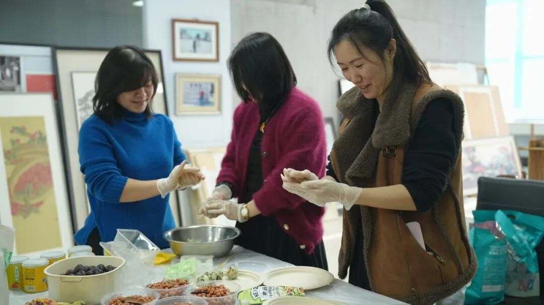 教学副院长李雪梅、科研副院长刘阳、综合办公室主任董春宇与张楠楠教授时刻惦念着留校学生的日常,利用休息时间不定期来到学院,带来亲手制作的暖心食物,让同学们在潜心创作的同时,感受到家一般的温暖。学院的细致保障,让同学们得以心无旁骛投入创作,也让冬日的绘画之路满是温情。近日,学院为留校创作的同学们准备了爱心聚餐,大家围坐一堂,畅谈创作心得、分享收获感悟。席间的欢声笑语,消解了创作的疲惫,更凝聚起艺院学子的同窗情谊。
