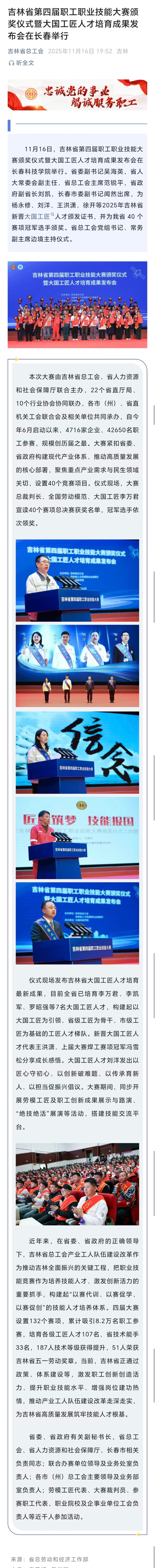 吉林省第四届职工职业技能大赛颁奖仪式暨大国工匠人才培育成果发布会在长春举行
