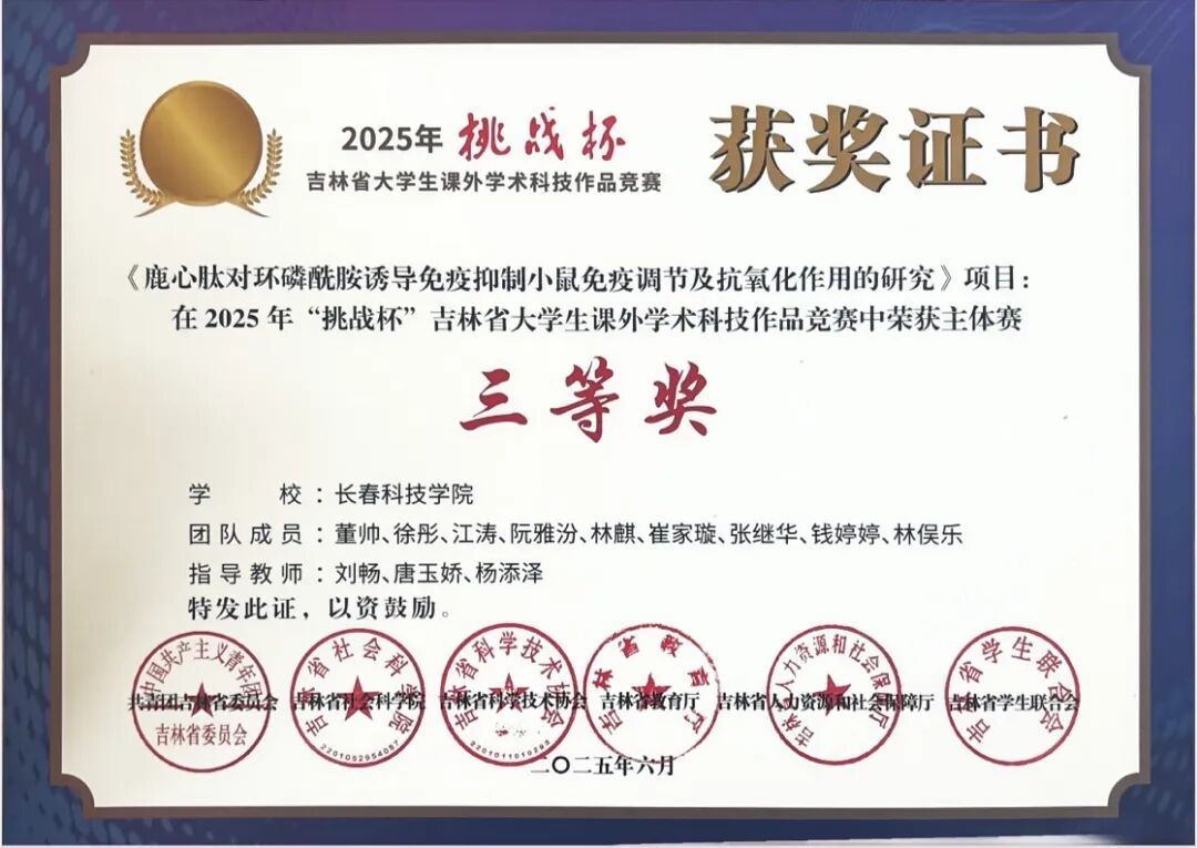 在全国高校商业精英挑战赛品牌策划竞赛全国总决赛暨(新加坡)全球品牌策划大赛中国地区选拔赛、国际大学生创新大赛、“挑战杯”、全国大学生生命科学竞赛等高水平赛事中,研究院师生团队斩获国家级、省级奖项数十项。多个项目聚焦鹿产业、不老莓、人参等吉林特色资源,实现科技创新与产业应用深度结合,彰显研究院“以赛促教、以赛促创”的育人特色。