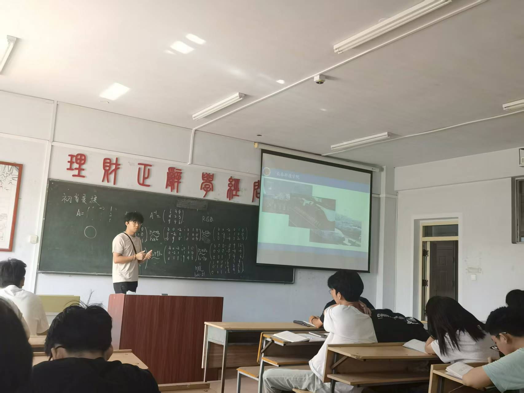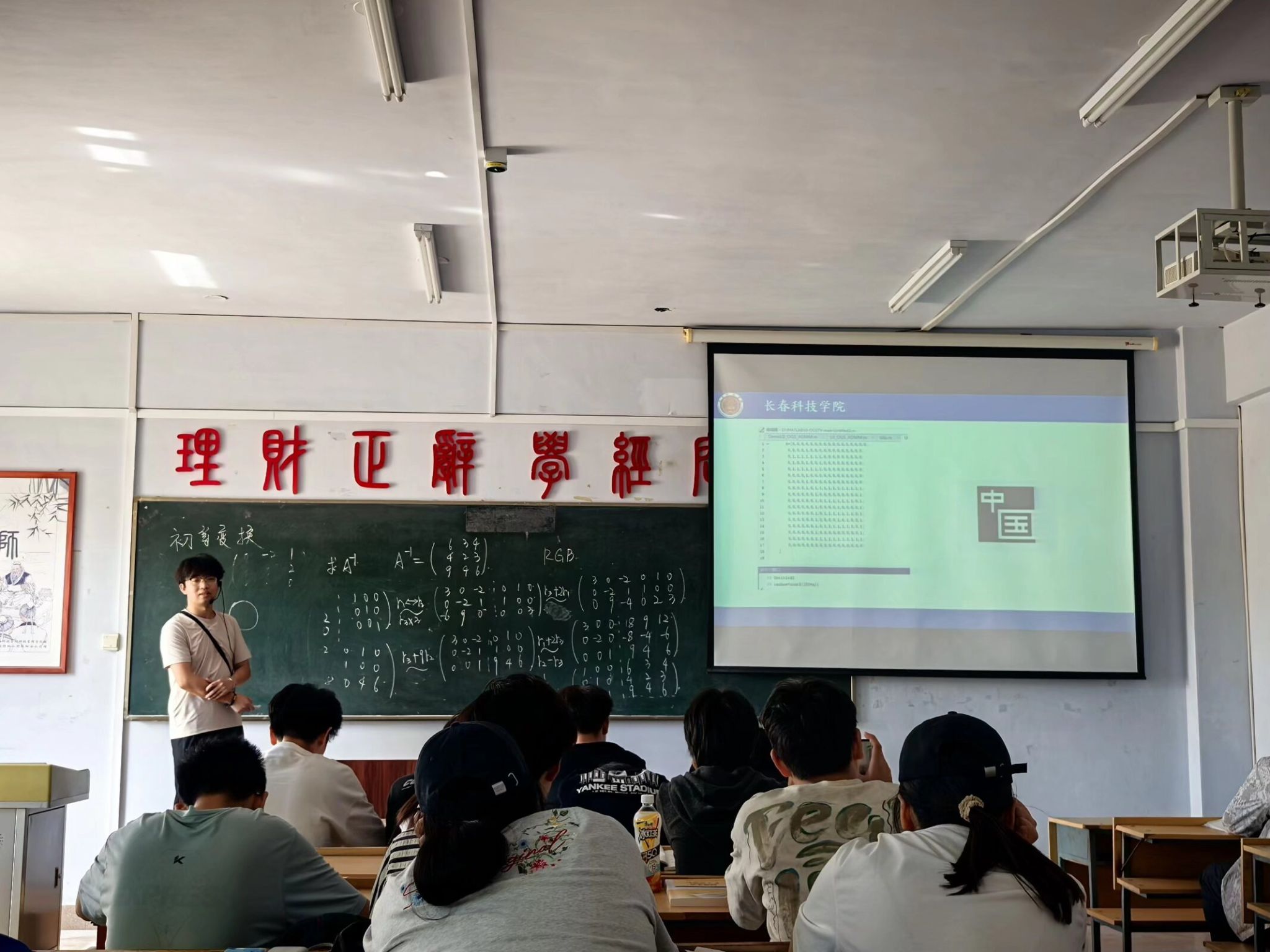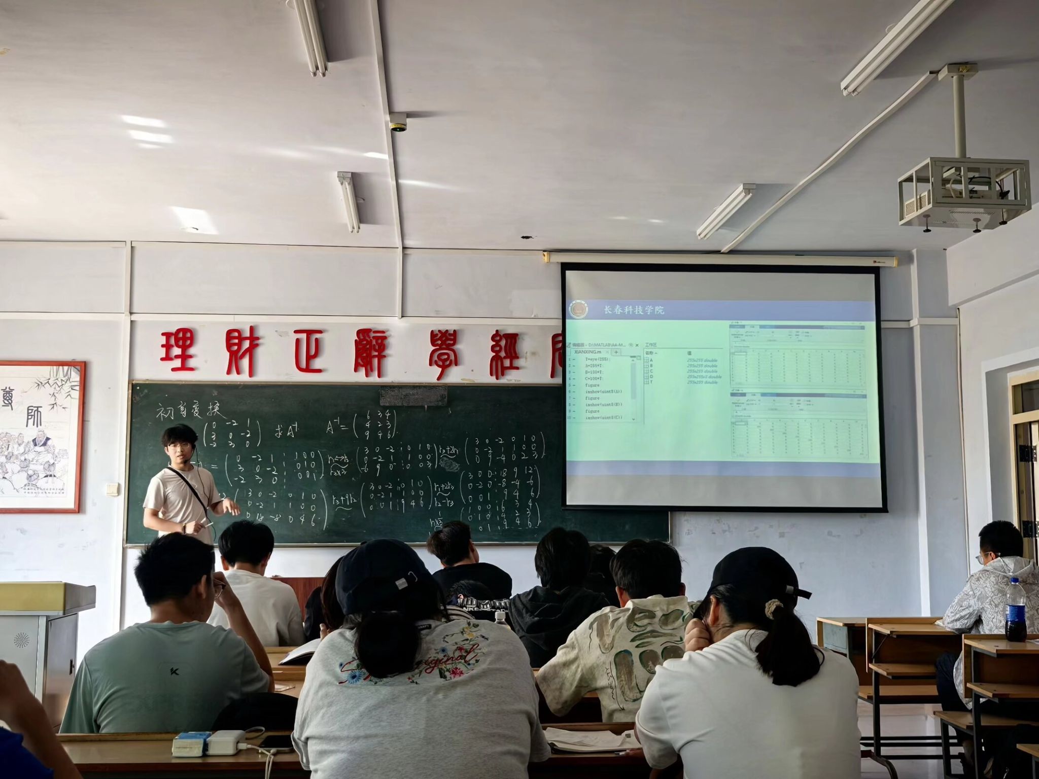 接下来,董老师向学生介绍了矩阵及其运算在图形图像学中的重要地位,他告诉学生,计算机视觉下的各个图像的本质就是一个个庞大的矩阵。为了让学生更好的理解,董老师又向学生介绍了图形图像矩阵的像素值与人眼视觉下的所观察到图像颜色的关系,当董老师通过MATLAB实时调整矩阵参数时,屏幕上的图像随之产生变化,抽象的初等变换理论瞬间转化为可感知的视觉图像,学生不断发出惊叹之声。