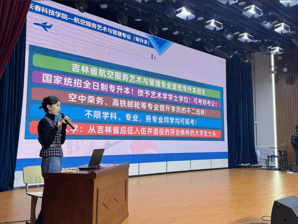2025年12月10日下午,长春科技学院本科航空服务艺术与管理专业专升本宣讲会在吉林交通职业技术学院知行楼401报告厅顺利举行。长春科技学院经济与管理学院院长赵立夫、航空服务艺术与管理专业校方主任张佳慧、北京广慧金通公司企业方主任李羿,以及吉林交通职业技术学院航空学院副书记卢颖共同出席本次活动,为专科学生搭建起通向本科深造的桥梁。