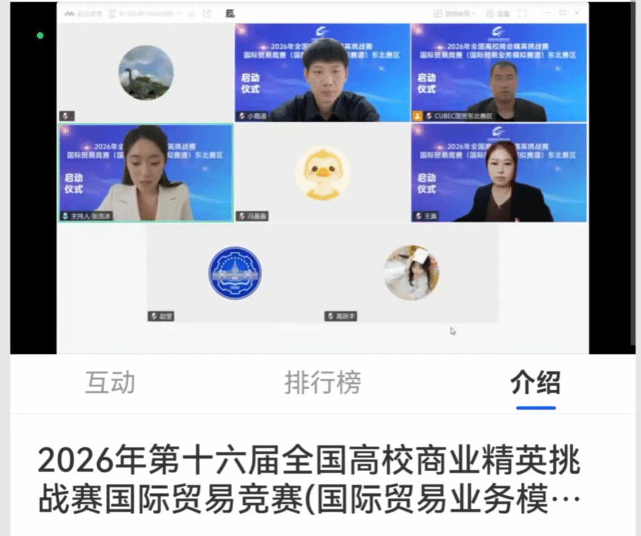 2025年12月14日上午,2026年第十六届全国高校商业精英挑战赛国际贸易竞赛(国际贸易业务模拟赛道)“步惊云杯”东北赛区启动仪式在线上隆重举行。东北地区多所高校的领导、嘉宾及师生齐聚云端,共同见证赛事启幕,为新一届竞赛注入活力。东北赛区组委会代表赵可心老师在致辞中,对到场嘉宾与师生表示热烈欢迎和诚挚感谢。他强调,全国高校商业精英挑战赛国际贸易竞赛作为高水平全国性赛事,已成为培养学子实践能力与国际视野的关键平台,对推动中国商科教育国际化、实践化发展意义深远。