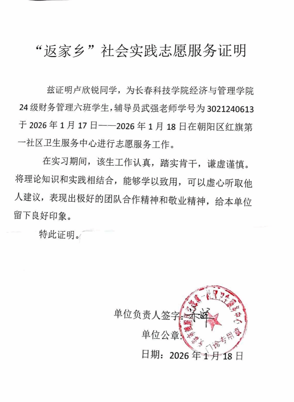 此次返家乡社区医院导诊实践,是一次理论与实践的深度融合,更是一次心灵的洗礼。它让我真切感受到基层医疗服务的重要性,也让我明白了青年一代应有的社会责任。未来,我将继续积极参与此类社会实践活动,用实际行动回馈家乡、服务社会,在奉献中实现自我价值。