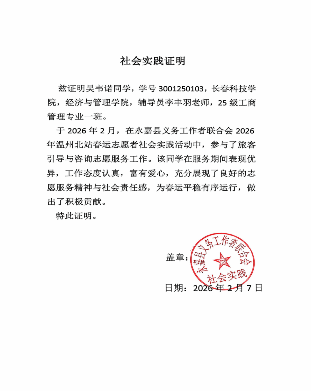 这次温州北站的春运志愿服务,是我第一次近距离接触铁路春运工作,也让我收获了诸多成长。我不仅熟悉了铁路客运的基本流程,提升了沟通协调、应急处理的能力,更懂得了换位思考与耐心包容的重要性。同时,我也看到了铁路工作人员的辛苦与担当,他们日夜坚守在岗位上,用专业与责任保障着春运的畅通,他们的精神也深深感染着我。 这段社会实践经历,是我大学生涯中宝贵的一课。它让我明白,志愿服务从来不是一句口号,而是脚踏实地的行动;新时代青年的担当,也体现在这些平凡的服务瞬间里。未来,我会带着这次实践的收获与感悟,继续积极参与各类志愿服务活动,用自己的点滴力量温暖他人、回馈社会,努力成为一名有责任、有担当、有温度的新时代青年。