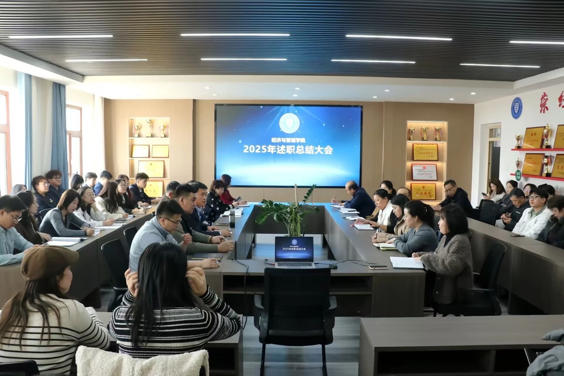 为全面总结2025年度工作成效,压实岗位职责,强化队伍建设,推动学院各项事业高质量发展,2026年3月12日,经济与管理学院在2号教学楼2413会议室隆重召开2025年度述职大会。学院院长唐敬仙教授、副院长成颖教授、副院长李尚越副教授、副书记武强副教授、院长助理陈海英教授及全体教职员工出席会议,会议由武强副书记主持。