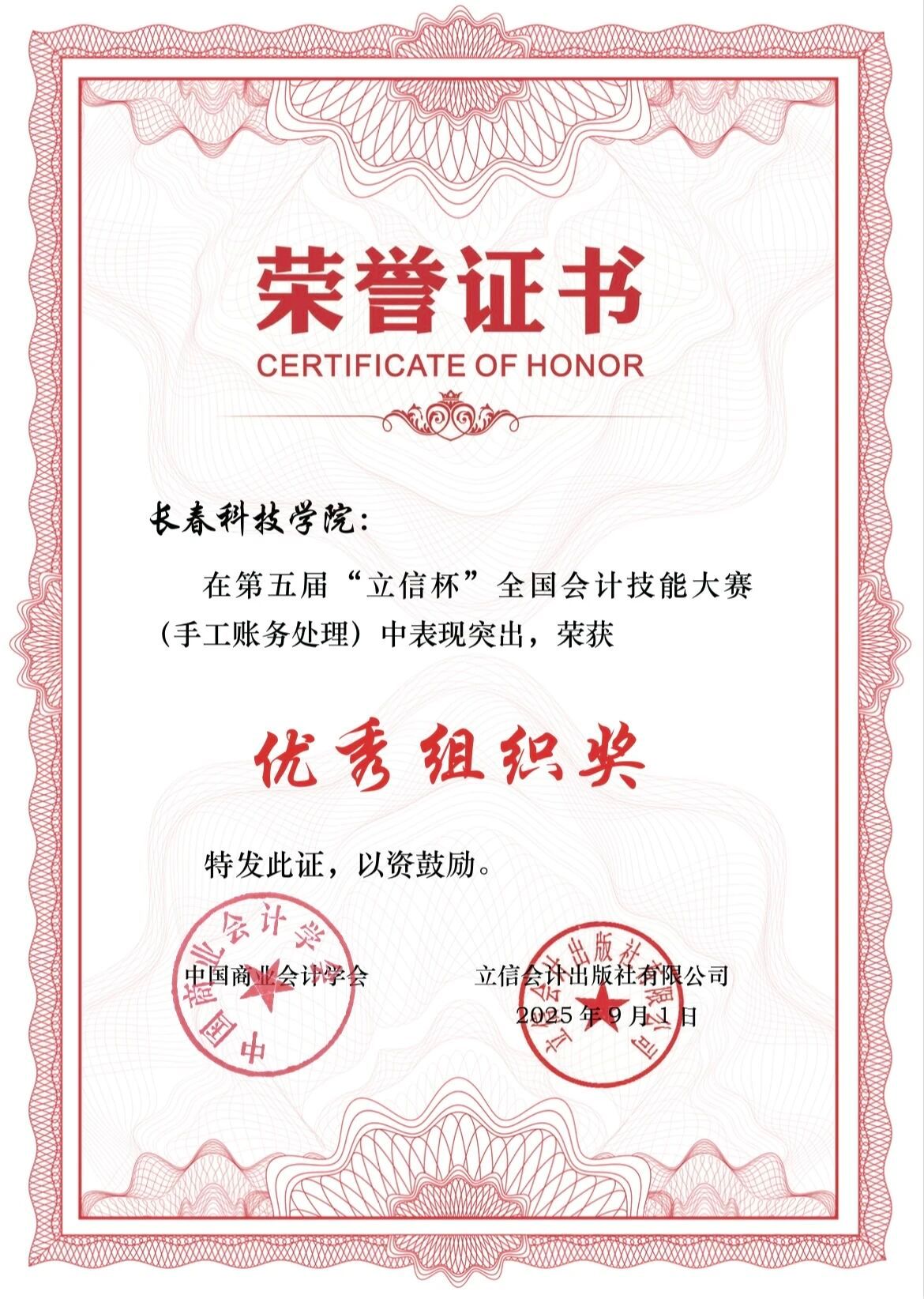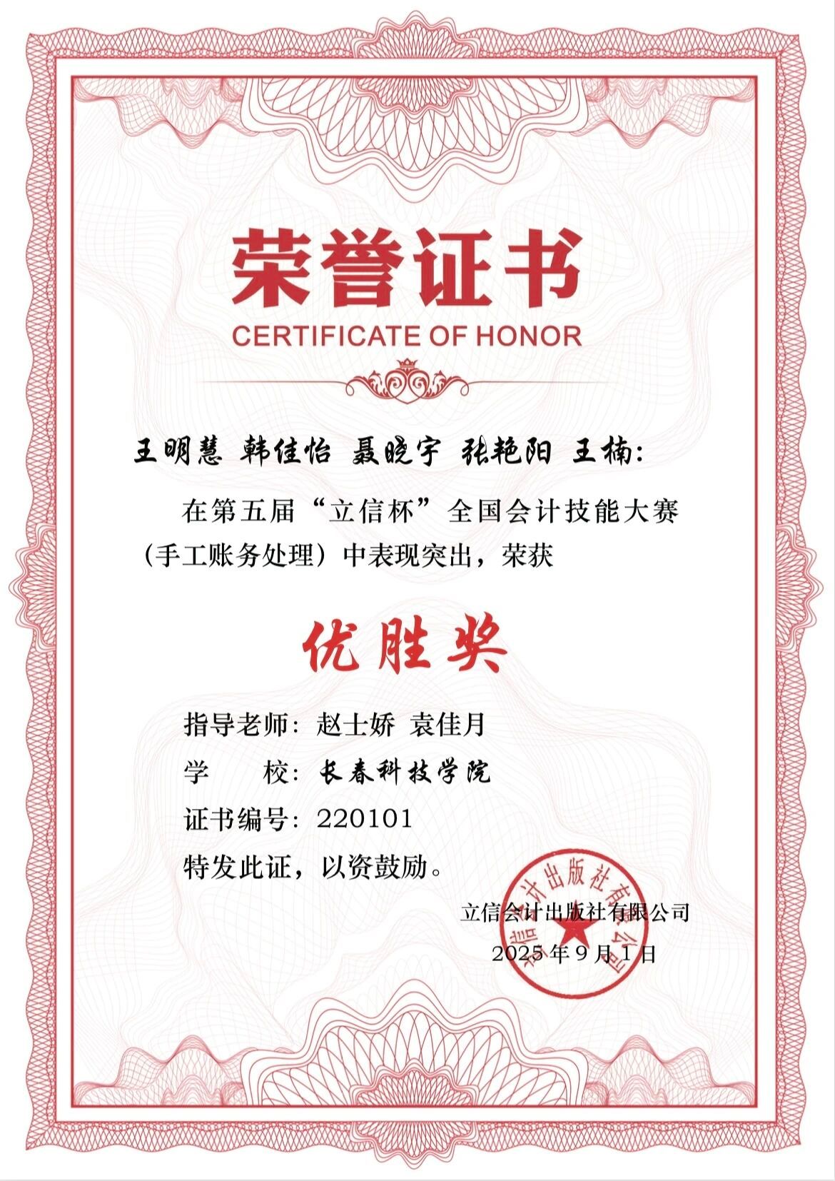 本次大赛聚焦手工账务处理全流程实操能力,以制造业仿真经济业务为背景,考核选手建账、原始单据处理、账簿登记、报表编制与分析等核心技能。赛事吸引全国众多院校参与,长春科技学院组建多支队伍参赛,在赵士娇、朱振东、袁佳月等指导老师的带领下,最终收获累累硕果: