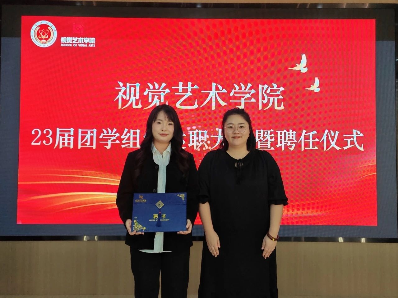 随后,进入聘书颁发环节,由视觉艺术学院党总支副书记山珊老师,分团委书记曹岩老师,学工办主任姜涛老师,23级辅导员安伟达老师,24级辅导员曲正媛老师为23届主席团、书记团、24级助理辅导员、各部门负责人及教官颁发聘书并合影留念。这一纸聘书,不仅是对他们过去一年辛勤付出的肯定与嘉奖,更是一份沉甸甸的责任与期许。接过聘书的同学们脸上洋溢着自豪的笑容,眼神中充满了对未来的坚定与憧憬。