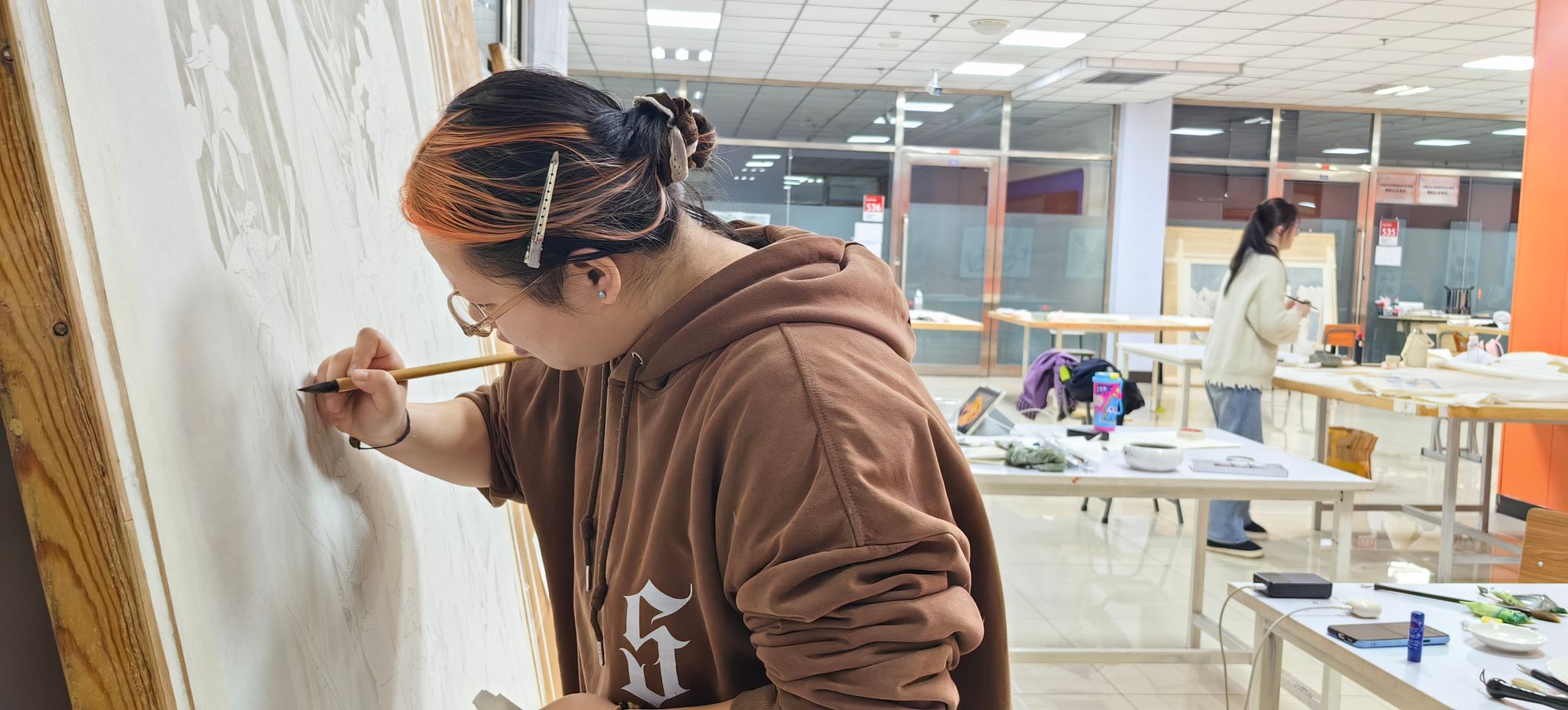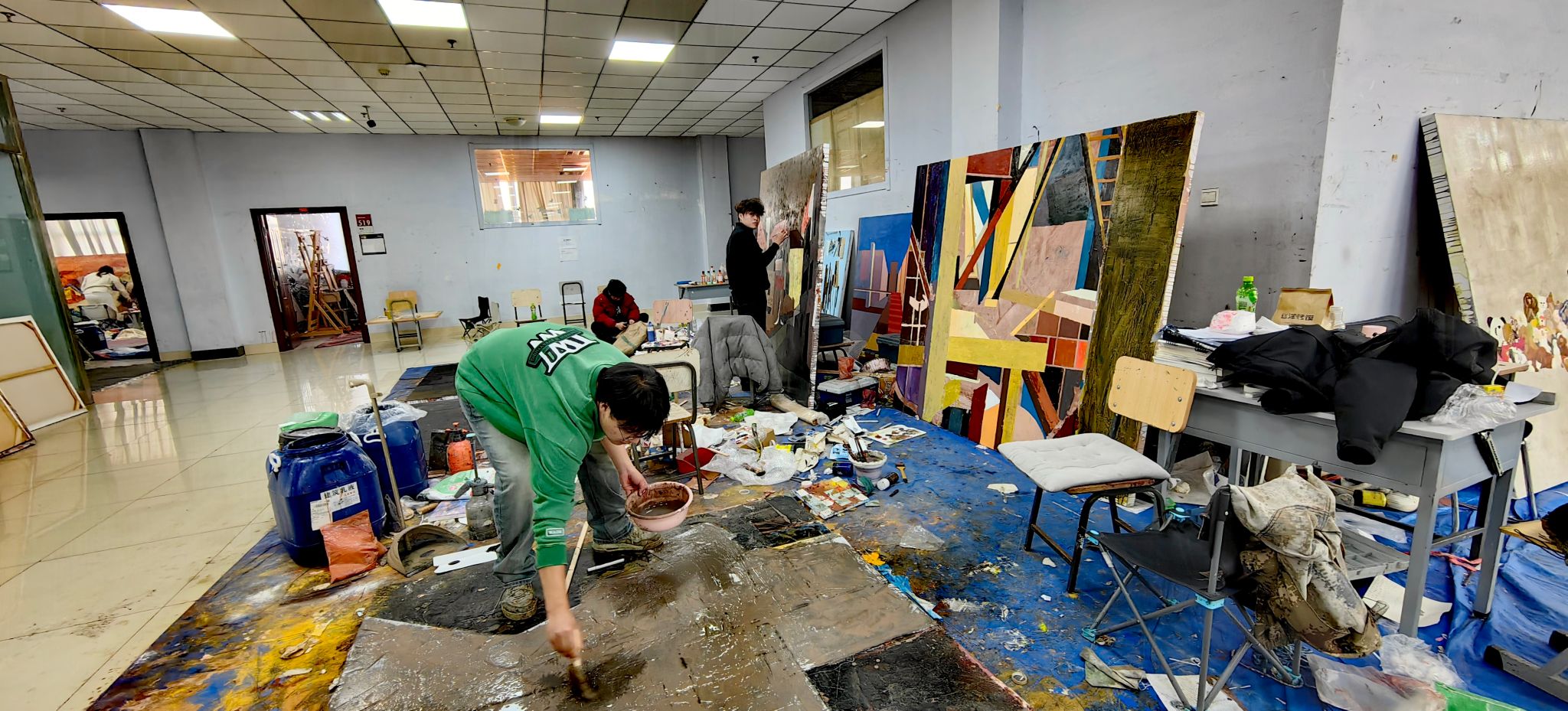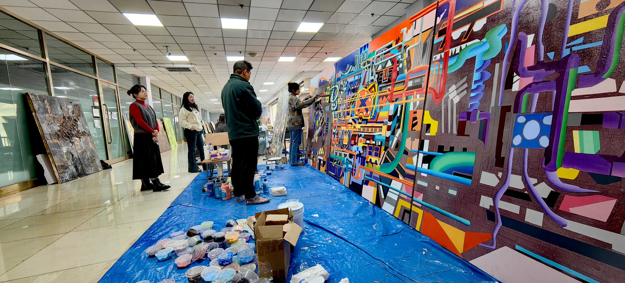 宋学智教授结合现场观摩的学生综合材料作品,从专业角度细致点评了其中空间构成,材料语言运用的亮点与可深化之处。曲鸽教授则从学生创作的表现形式出发,对学生作品中的形式探索与观念表达给予指导,并鼓励大家保持住对创作的热情和探索的勇气。