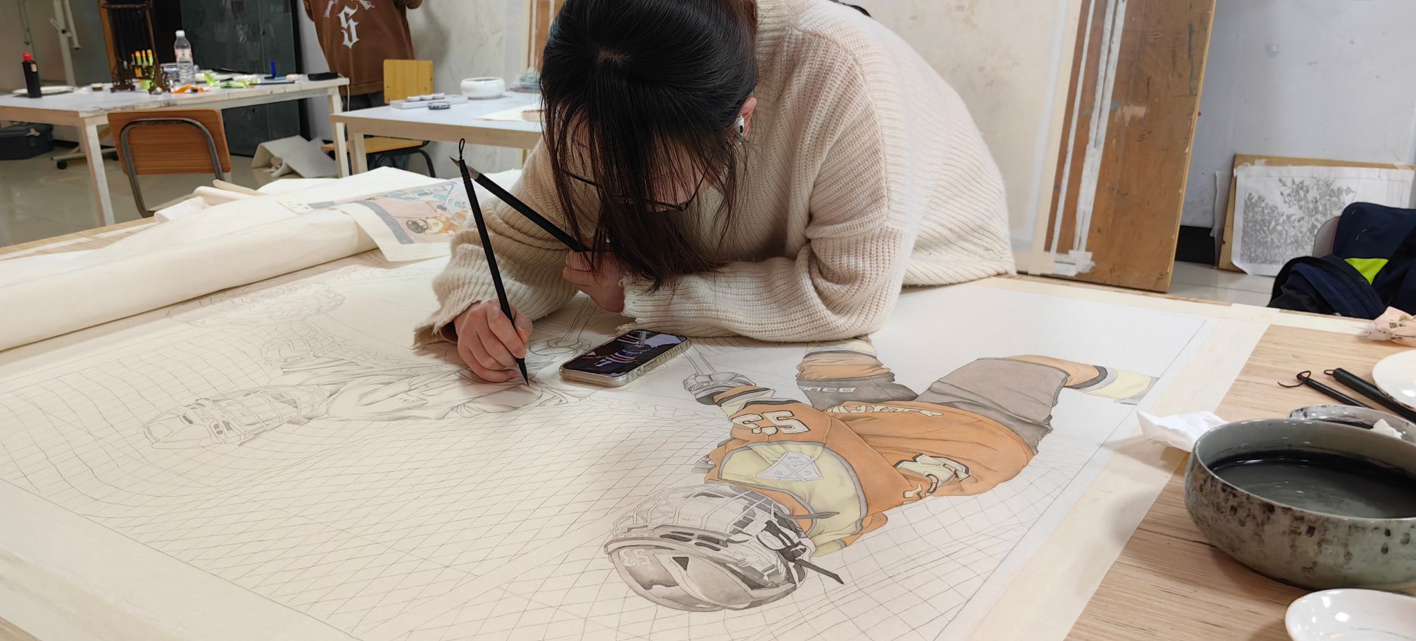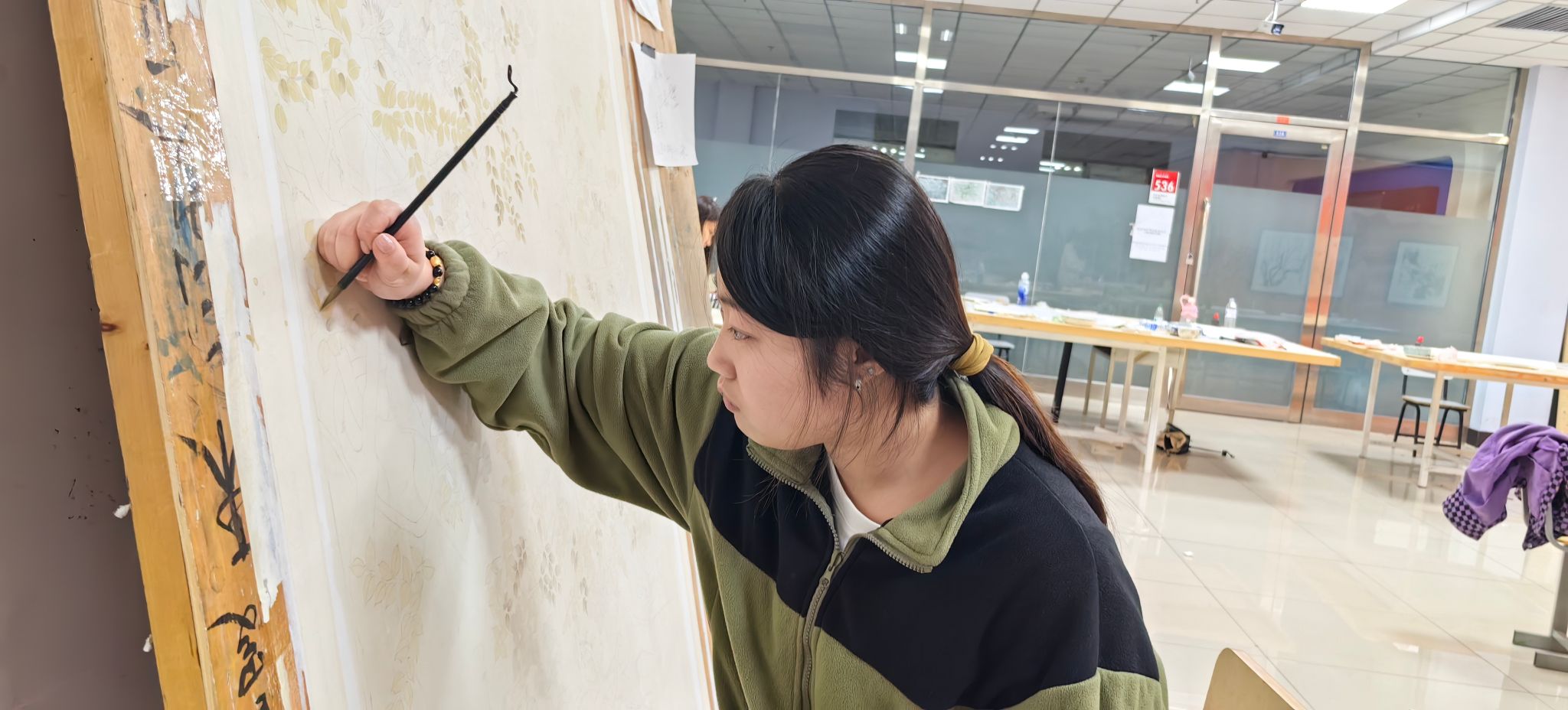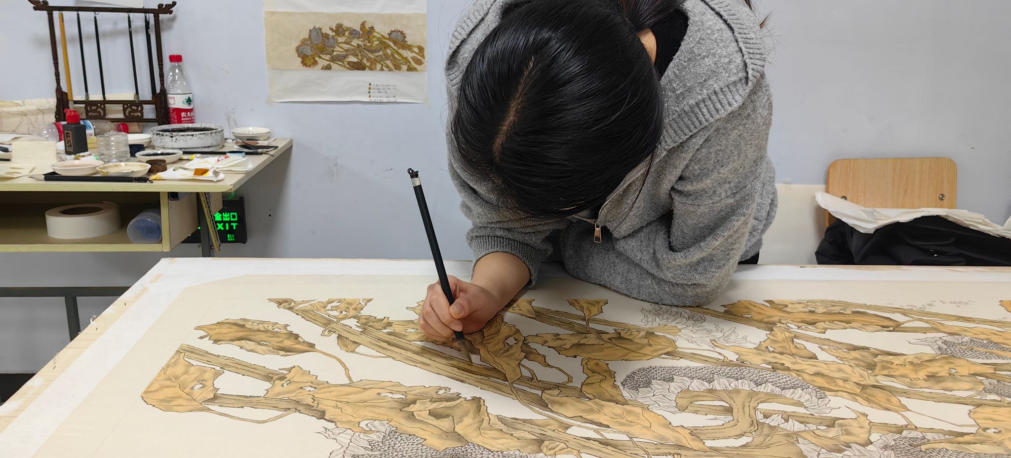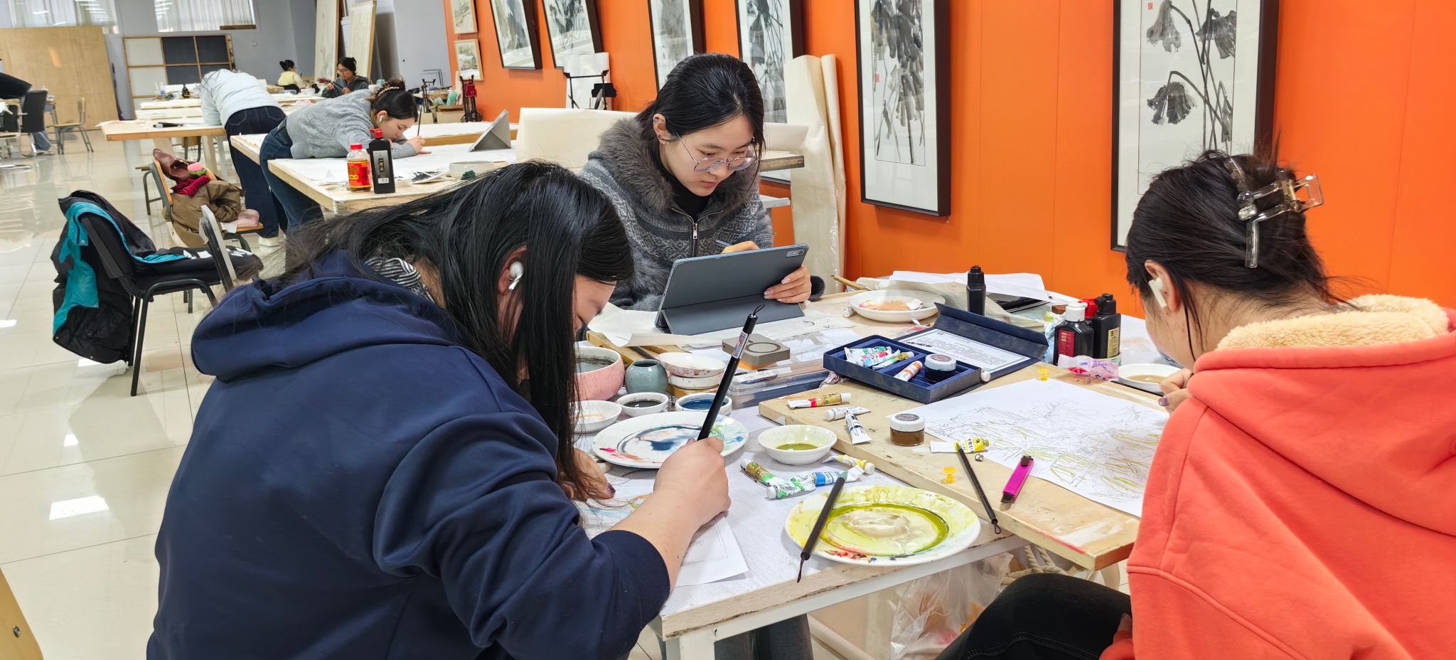 随后专家们又来到美术学专业学生优秀作品展厅和艺术设计专业毕业作品展厅,详细了解了学生们的创作过程,李雪梅副院长介绍了学院在课程建设,过程性考核等教学环节的具体做法,重点介绍了组群式项目教学在人才培养过程中所发挥的作用。在美术学专业大四创作现场,时值寒假,学生们仍留校全身心投入打磨自己的作品,那份专注与执着,尽显自主学习的热情与精益求精的态度,面对来访的专家,学生们认真倾听专家对作品提出的指导建议,详细回答了专家们关心的问题。学生们这份对作品的自信、热爱,从容自信的学习状态,获得专家们的一致赞赏。