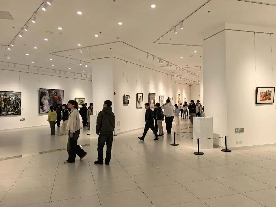 观展过程中,专业老师为同学们进行展览导览,结合作品创作背景、艺术特色与表现手法讲解,引导大家理解作品背后的创作理念与文化内涵。师生们驻足凝视,交流感悟,同学们认真聆听讲解,在观赏中学习思考。作为课堂的实践教学延伸,本次观展活动引导学生从专业视角赏析作品、汲取养分。同学们重点关注不同作品的材料运用与表现形式,对传统绘画媒介的创新应用有了直观认识,记录下观察与思考。