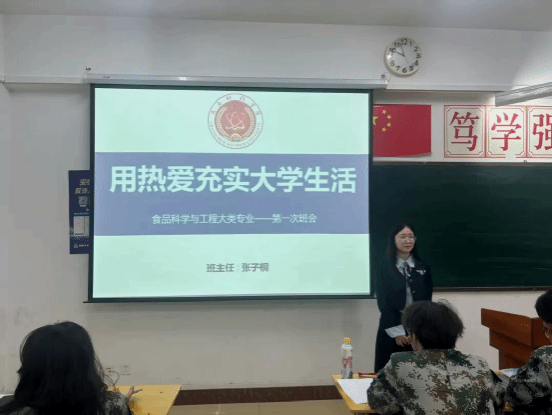 学院新闻 锚定热爱,启航新程 ——2025 级食品科学与工程大类专业首次班会圆满举行为助力新生顺利完成从高中到大学的角色蜕变,深度融入学院专业学习氛围,9月29日晚,2025级食品科学与工程大类专业第一次班会在4504教室温情召开。本次班会由班主任张子桐老师主持,全体新生齐聚一堂,共同翻开大学学习生活的崭新篇章。班会伊始,张子桐老师以 “用热爱充实大学生活” 为核心主题,结合自身成长经历与教育感悟,与新生们分享大学阶段的成长心得。...