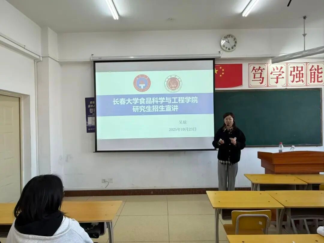 学院新闻 生命科学学院邀请长春大学食品科学与工程学院科研副院长吴琼教授来我校举办考研专题宣讲会为帮助2022、2023级食品质量与安全、食品科学与工程专业学子明确考研目标、科学规划学术道路,10月23日13时,我院特别邀请长春大学食品科学与工程学院科研副院长吴琼教授来我校举办考研专题宣讲会。凭借深厚的科研积淀、丰富的育人经验与前沿的行业视野,吴琼教授为在场学子呈现了一场兼具学术深度与实践指导意义的精彩分享。宣讲会上,...