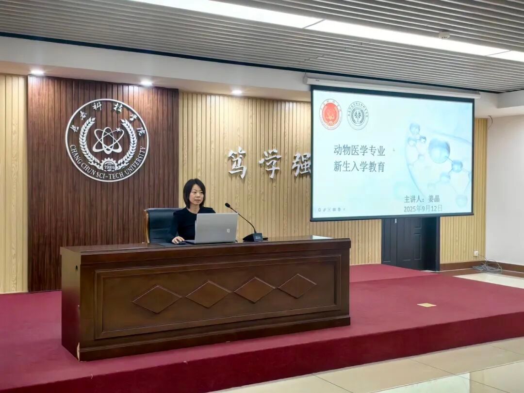 活动伊始,动物医学专业主任姜晶率先为新生奠定专业认知基础。她系统介绍了长春科技学院概况,以及动物医学专业的发展历程与现状:专业自2005年首次招生以来,历经20年深耕,已成长为吉林省一流本科专业;累计招收本科生2133人,为社会输送应用型人才1363人。专业学制为5年,学生毕业授予农学学士学位。在核心实力展示环节,姜晶主任重点提及师资与平台优势:现有专任教师19名,其中博士9名、硕士10名,正高级职称7人、副高级职称7人,高级职称占比达73.7%;科研与实践平台建设成果显著,拥有国家级鹿茸生物实验室、东北首个校企共建鹿产品检测中心及省级科研平台,配备基础兽医学实验室、预防兽医学实验室、临床兽医学实验室、显微镜室4个专业实验室,并与博瑞科技、正业生物、牧原集团、周萍动物医院等40余家企业共建实习基地,覆盖动物疾病防治、临床诊断与治疗、动物保健、疫病防控、饲养技术、兽药研发全产业链。