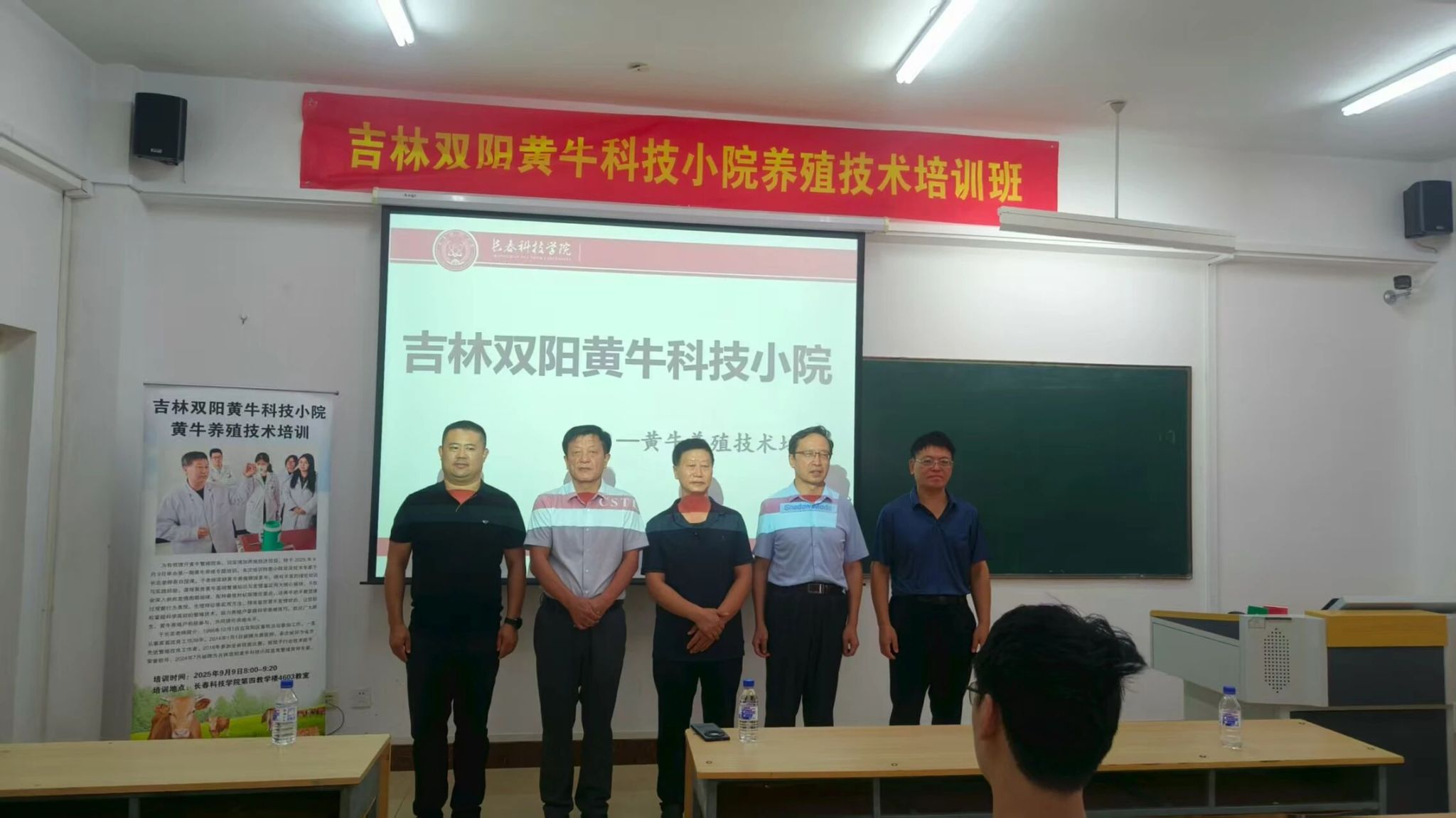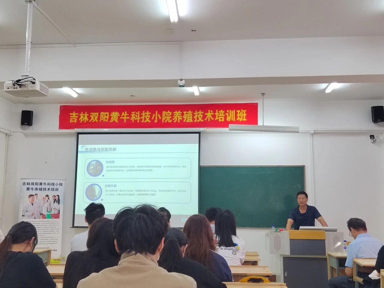为将前沿畜牧技术与实践经验融入校园教学,近日,我校特邀双阳区畜牧总站高级兽医师、吉林双阳黄牛科技小院技术专家于长忠老师,开展以提高黄牛繁殖改良技术为主题的科普讲座。双阳区科协赵志军主任等领导莅临指导,生命科学学院动物科学专业主任刘春杰、教师王泽、包欣宇及 2022 级、2023 级动物科学专业学生共同参与,现场学习氛围浓厚。