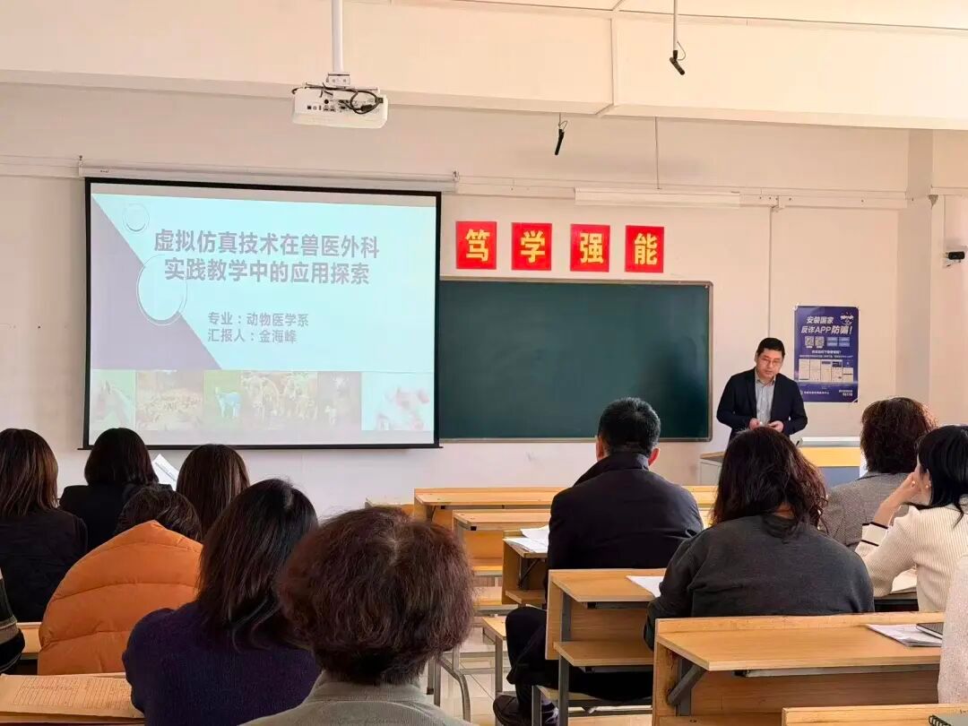 本次动物医学专业选定“人工智能技术在教育教学中的应用策略与实践案例”为研讨核心方向。金海峰博士以 “虚拟仿真技术在兽医外科实践教学中的应用探索” 为题展开专题汇报。他系统介绍了虚拟仿真技术的发展现状与政策支持背景,结合吉林省 “示范项目 - 一流课程 - 创新实验室” 三级建设体系,指出该技术是破解兽医外科学实践教学资源匮乏、临床病例不足、实践机会有限等难题的有效路径。汇报中,金海峰博士详细阐述了虚拟仿真技术在提升教学安全性、增强学习体验感、丰富教学资源、强化团队协作训练及实现精准教学评估等方面的显著优势,同时客观分析了虚拟仿真技术应用面临的硬件投入高、软件维护难、教师培训需求迫切等挑战。