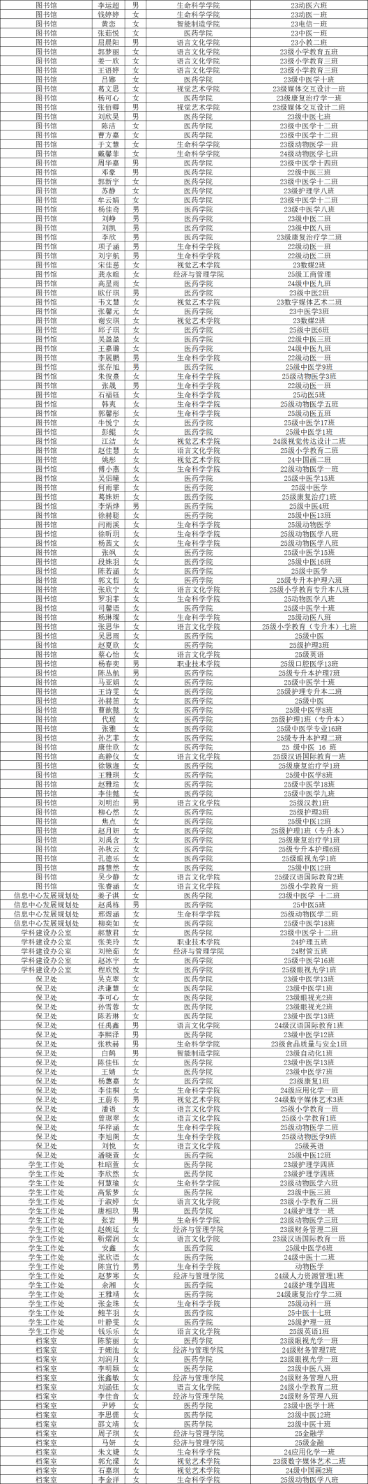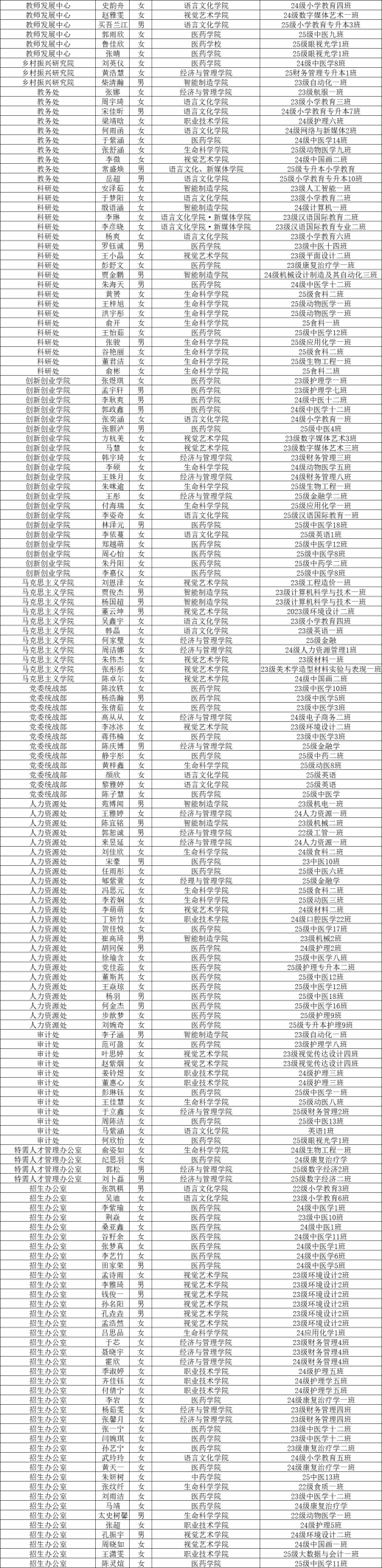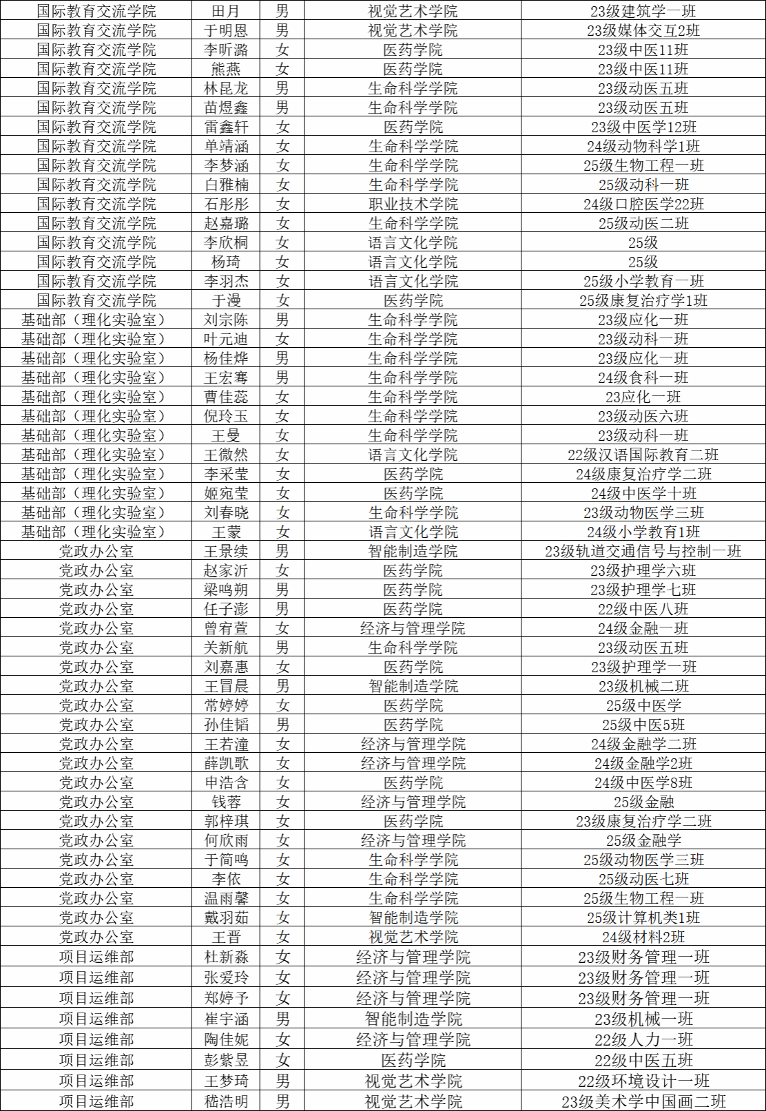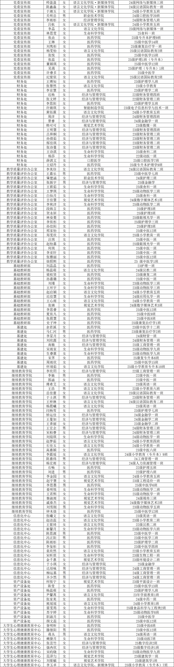 为构建实践育人长效机制,帮助学生在校务实践中提升综合能力,同时优化行政服务效能,搭建知行合一的成长平台。校团委近期开展2025-2026学年第一学期校内社会实践岗位招募活动。此次招募不仅能为我校学子创造锤炼沟通协作、组织执行能力的实践场景,亦能为校园治理注入青春活力,构建教学相长、双向赋能的可持续发展格局。经过报名、审核、选拔等环节,最终确定532名学生作为本学期校内社会实践岗的工作人员,现将名单公示如下: